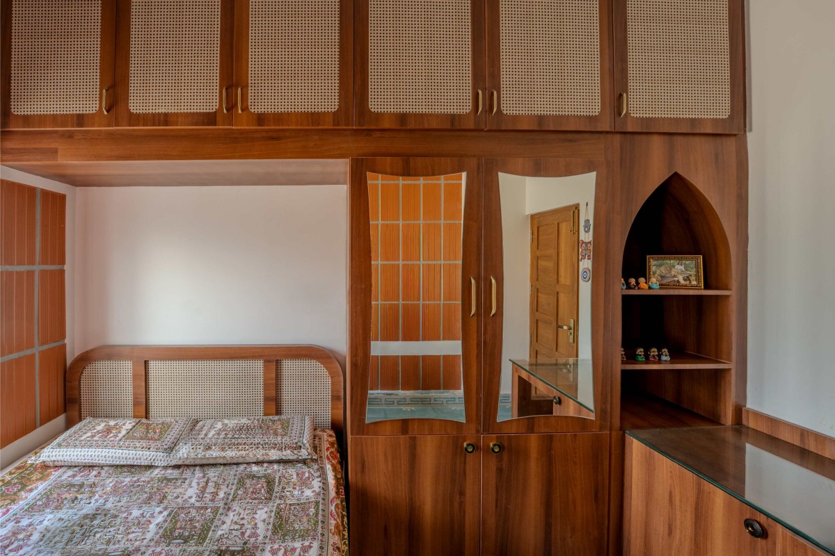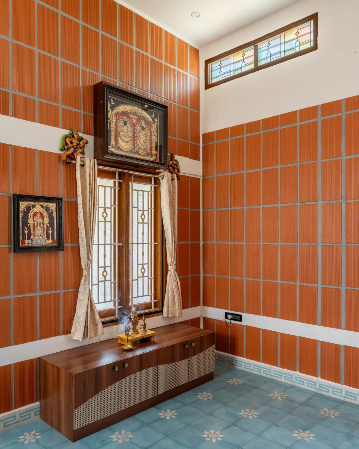 Material selection played a crucial role in achieving thermal comfort. The house is predominantly constructed using porotherm blocks, known for their insulation and energy efficiency. The southwestern façade is subtly inclined toward the northwest, enabling indirect daylight penetration while preventing direct heat gain. Traditional handmade Athangudi tiles are used for flooring throughout the house, enhancing thermal performance while adding cultural richness to the interiors.