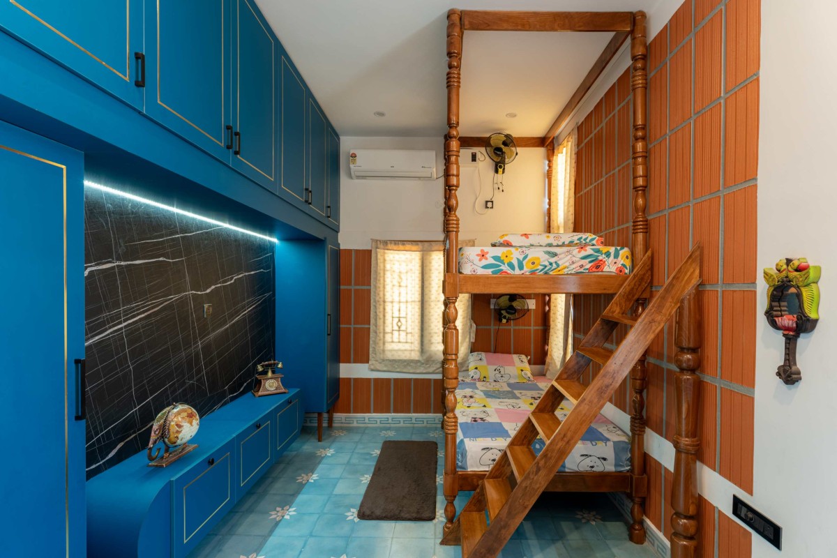 The kids’ bedroom features custom-designed bunk beds crafted in a traditional style, complete with carved wooden railings and a compact wooden staircase, making the space both functional and playful.