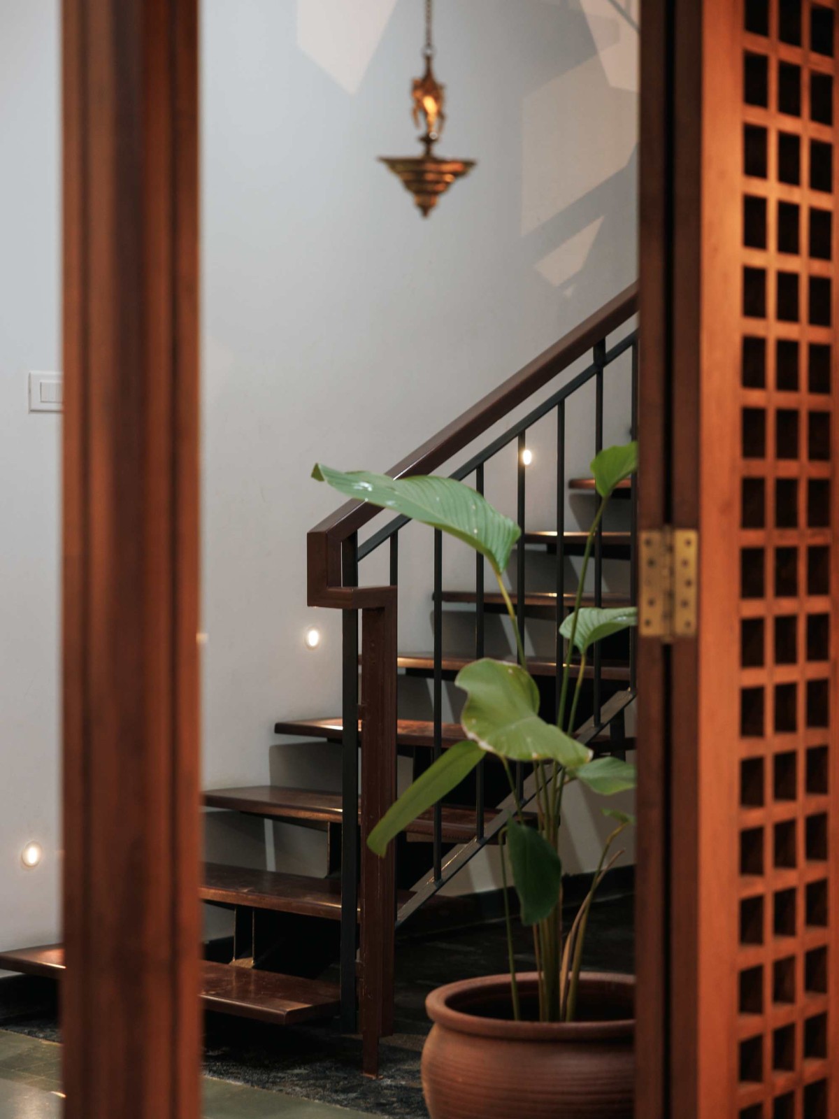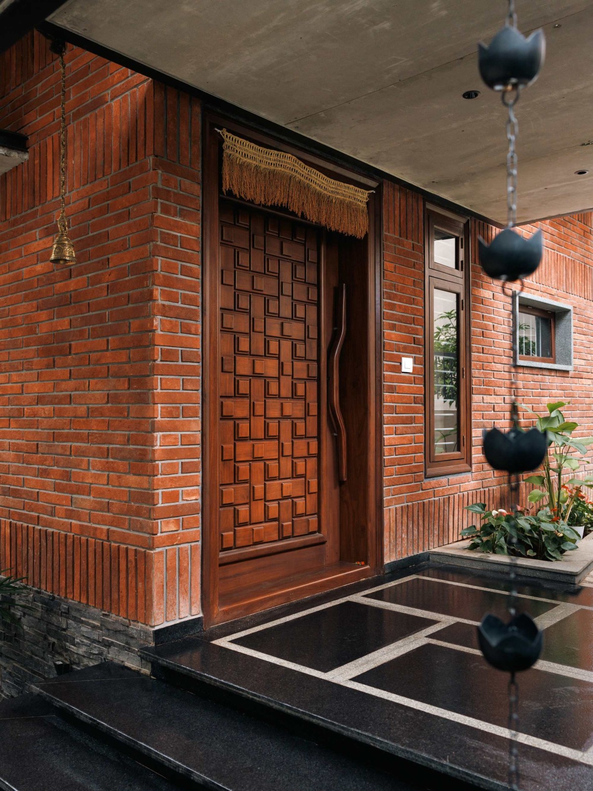 Along this pathway, subtle yet meaningful design elements pay homage to the family’s past. A brass bell, a small elephant mural, and a stepped seating area, each crafted from natural materials evoke memories of their previous home. These features not only add a tactile richness to the design but also reinforce the connection between the old and the new, anchoring the home in a sense of continuity.