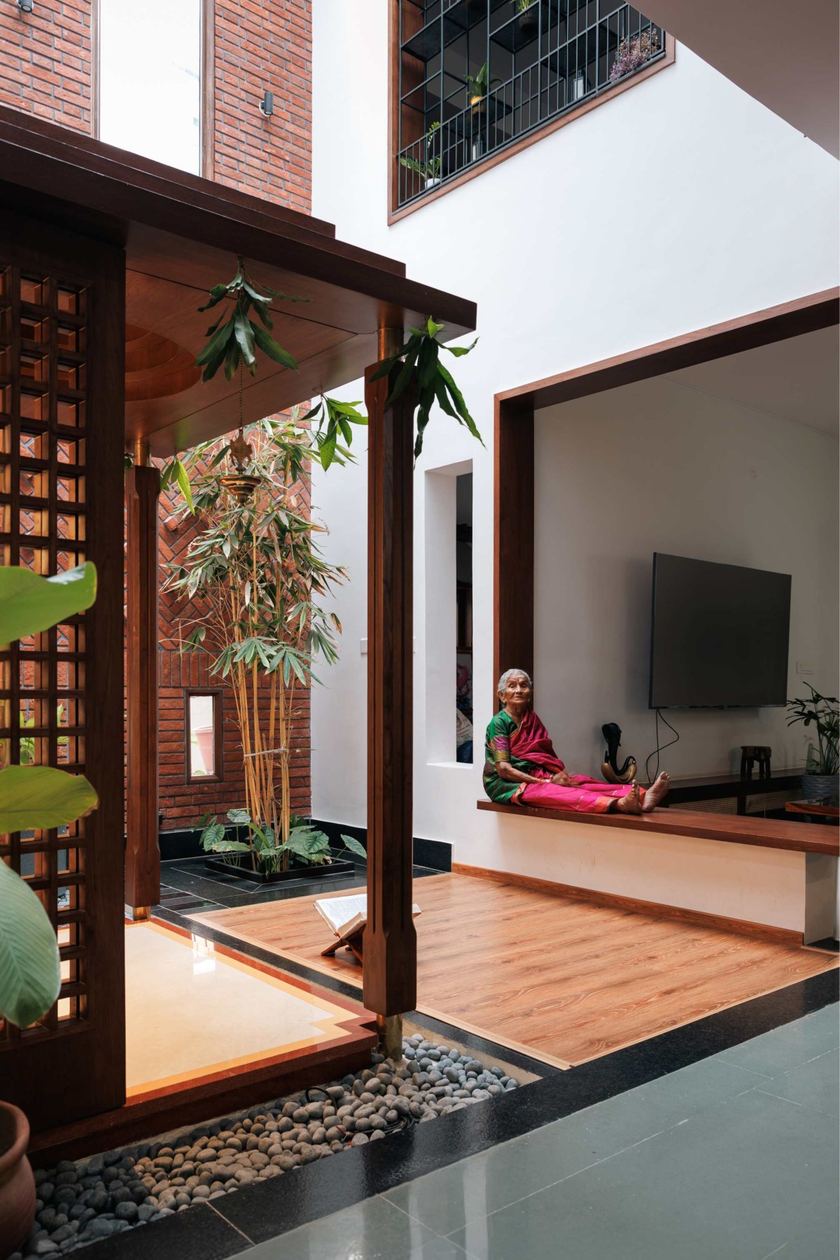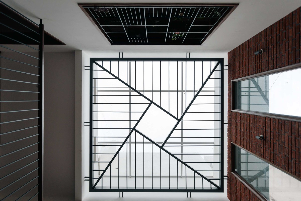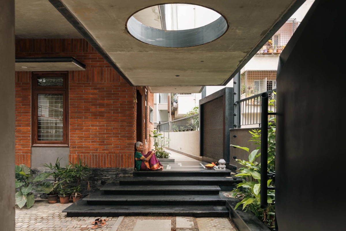 The vertical zoning of the home was carefully considered to meet the needs of its multigenerational inhabitants. The ground level caters to the elderly, offering spaces for spirituality and leisure, with easy access to the outdoors. In contrast, the upper level is designed for the younger generation, featuring a living area and study that open onto a secure balcony overlooking the lower levels fostering both privacy and connection.