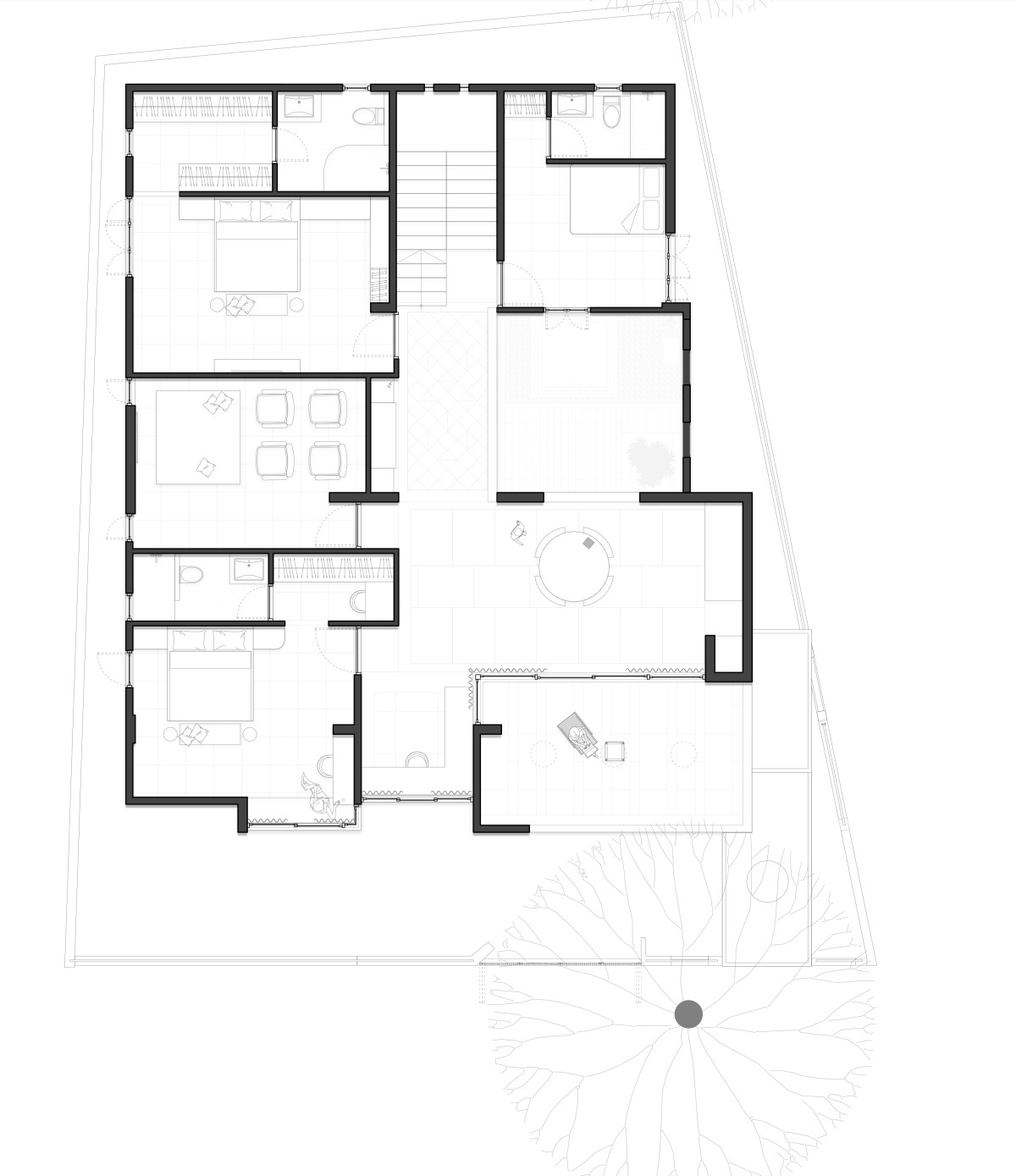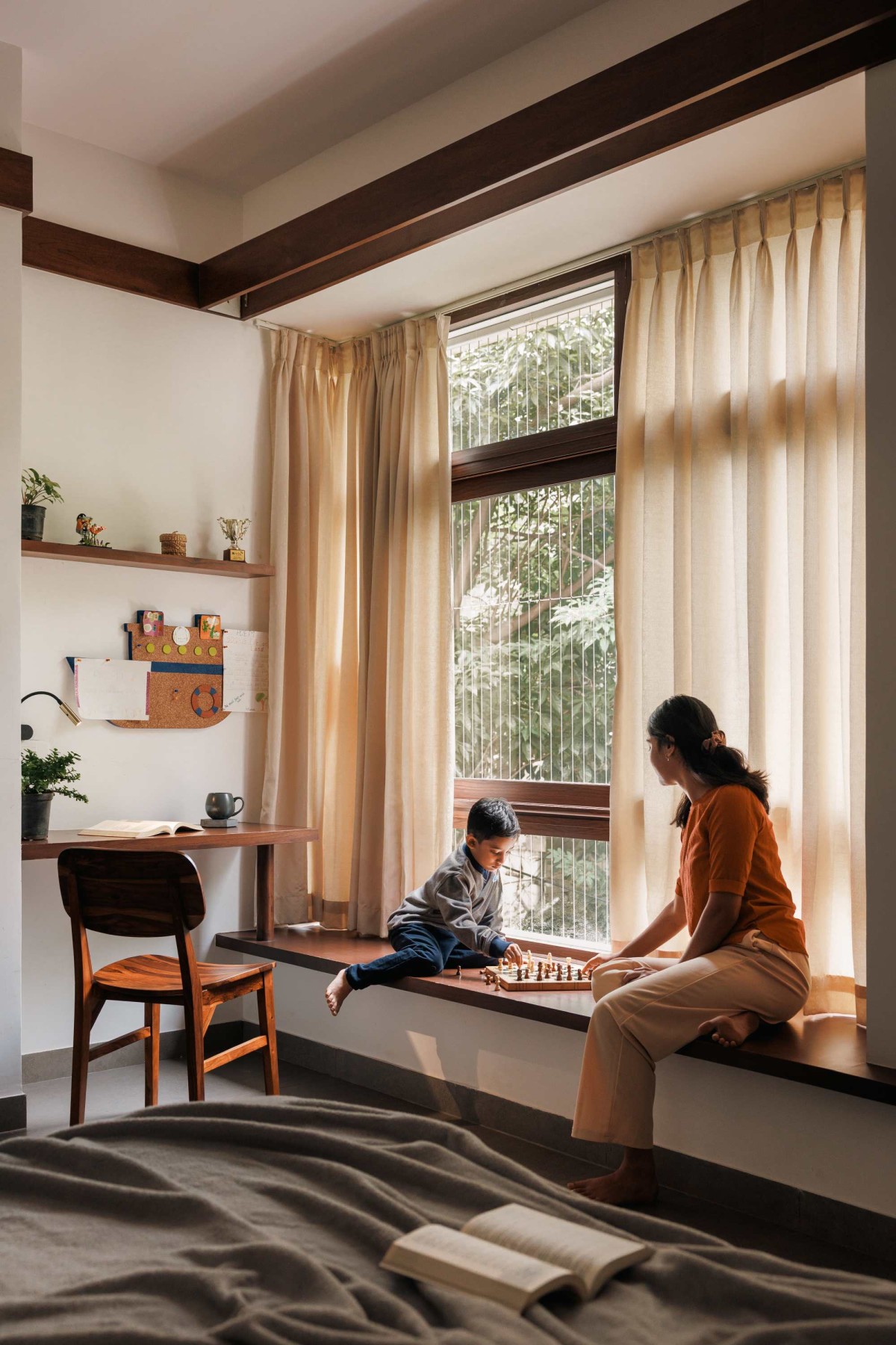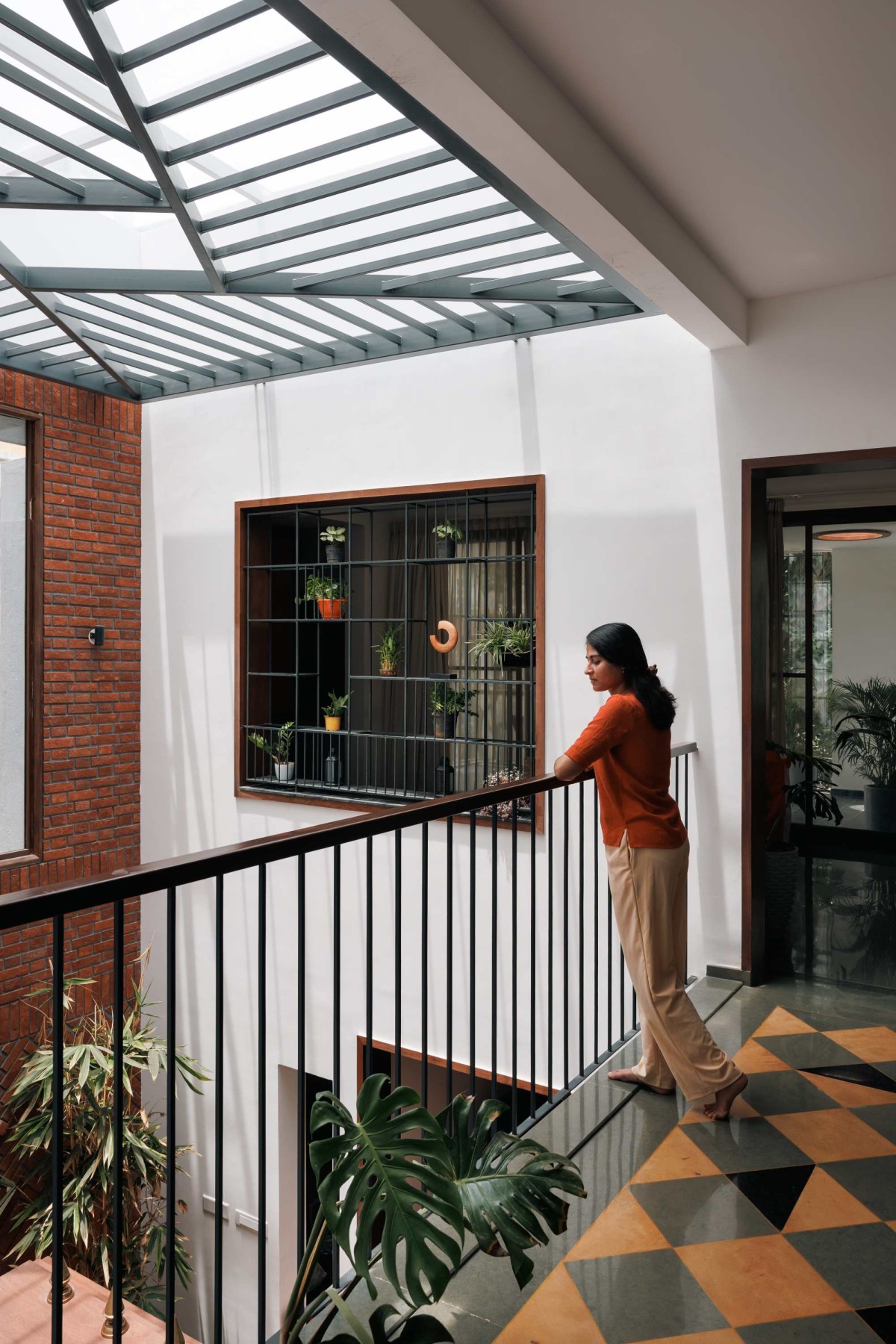 The vertical zoning of the home was carefully considered to meet the needs of its multigenerational inhabitants. The ground level caters to the elderly, offering spaces for spirituality and leisure, with easy access to the outdoors. In contrast, the upper level is designed for the younger generation, featuring a living area and study that open onto a secure balcony overlooking the lower levels fostering both privacy and connection.