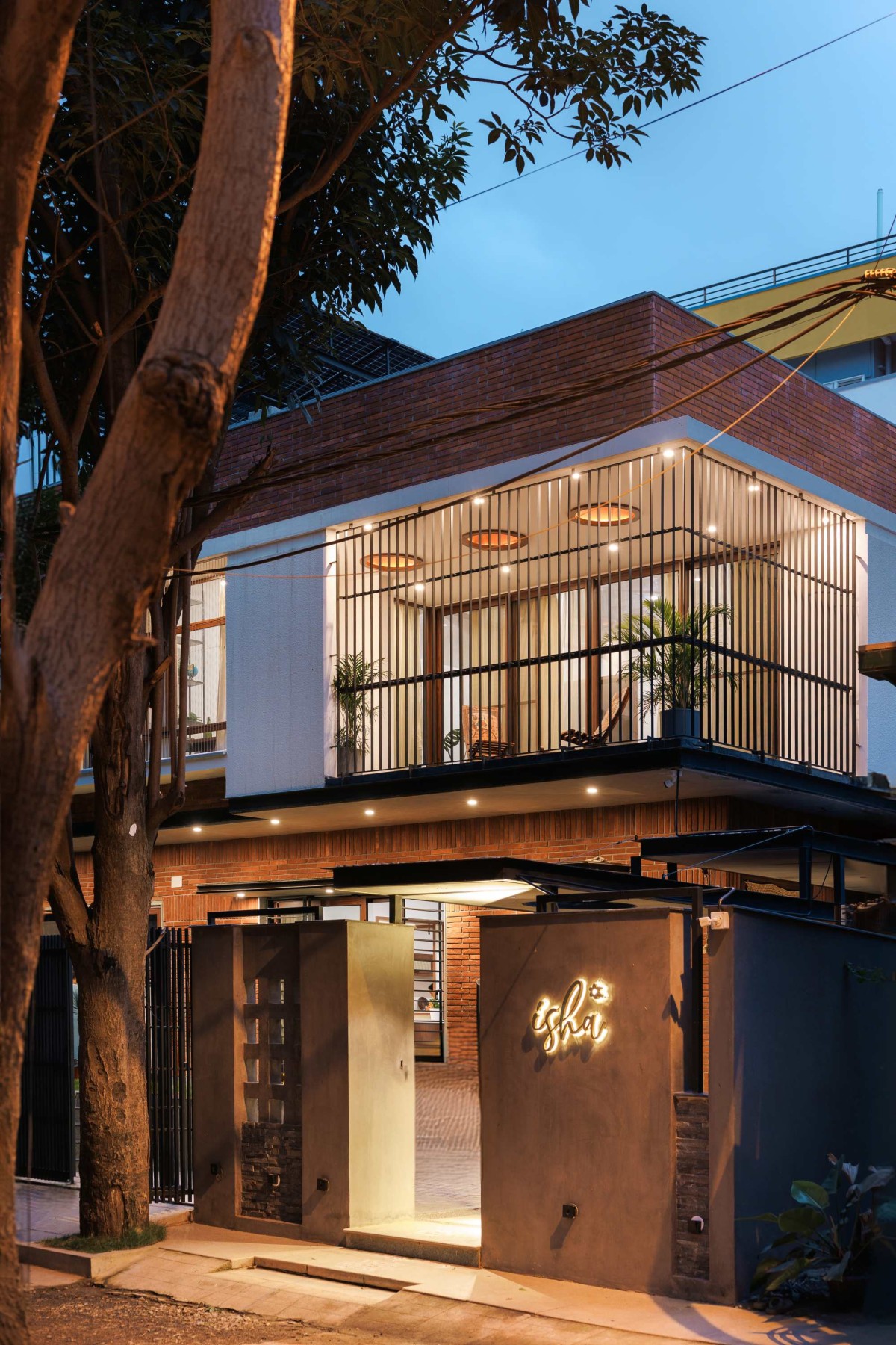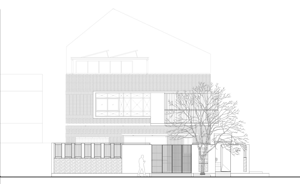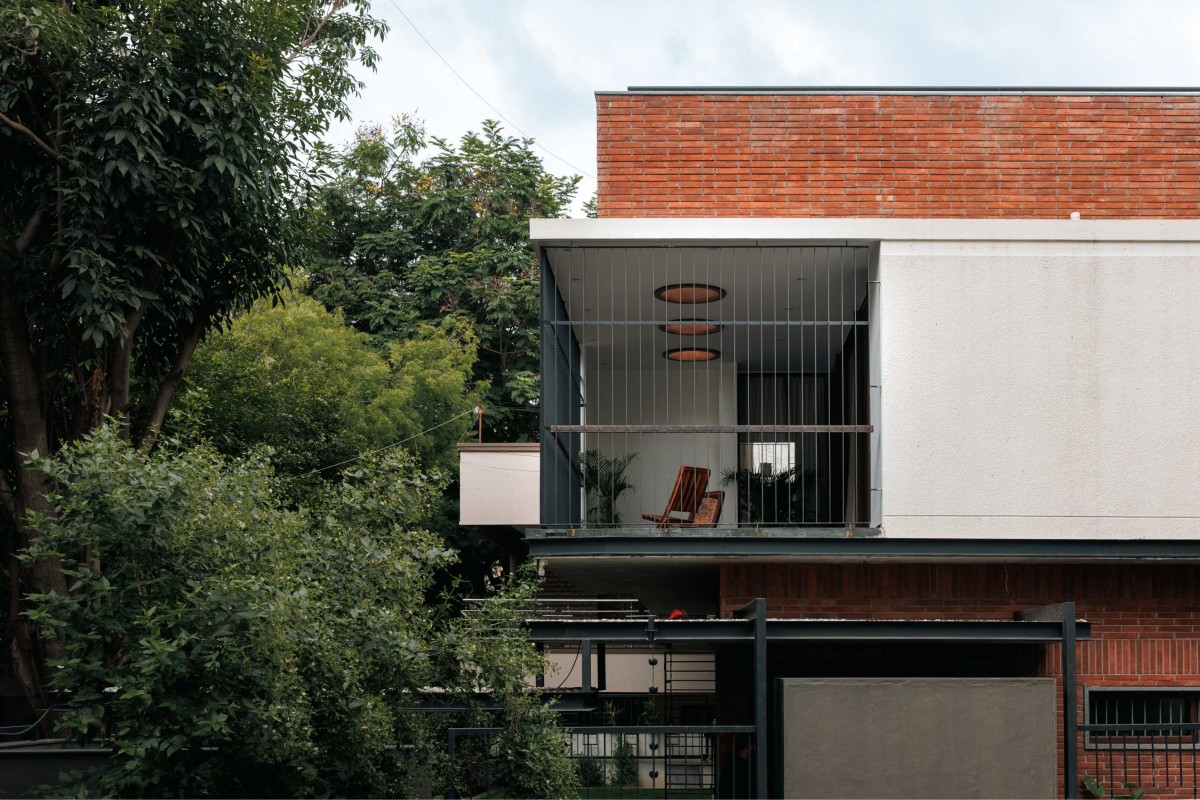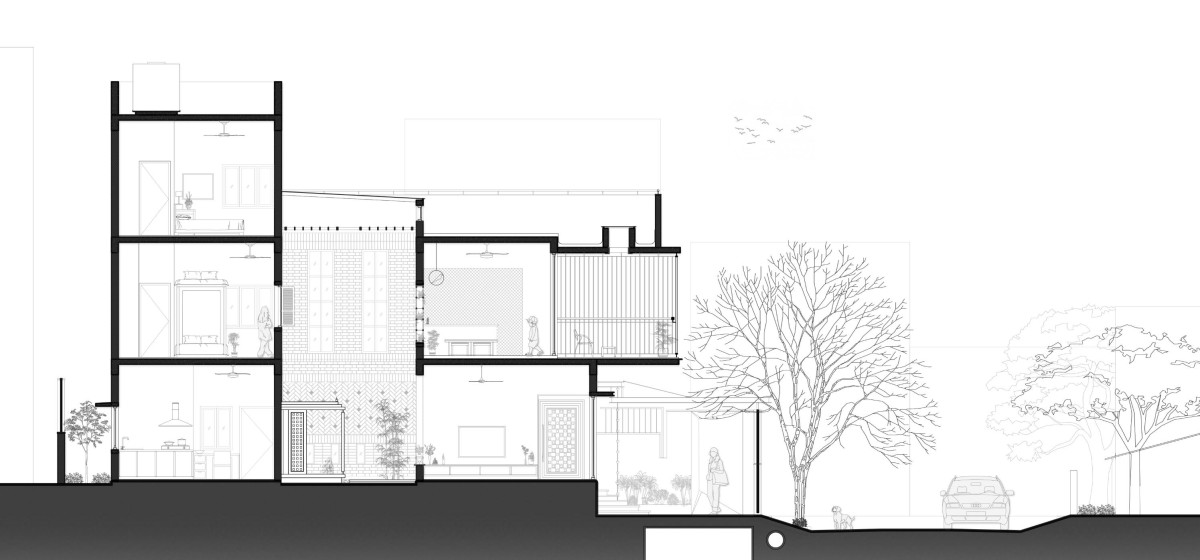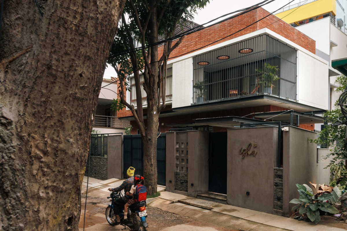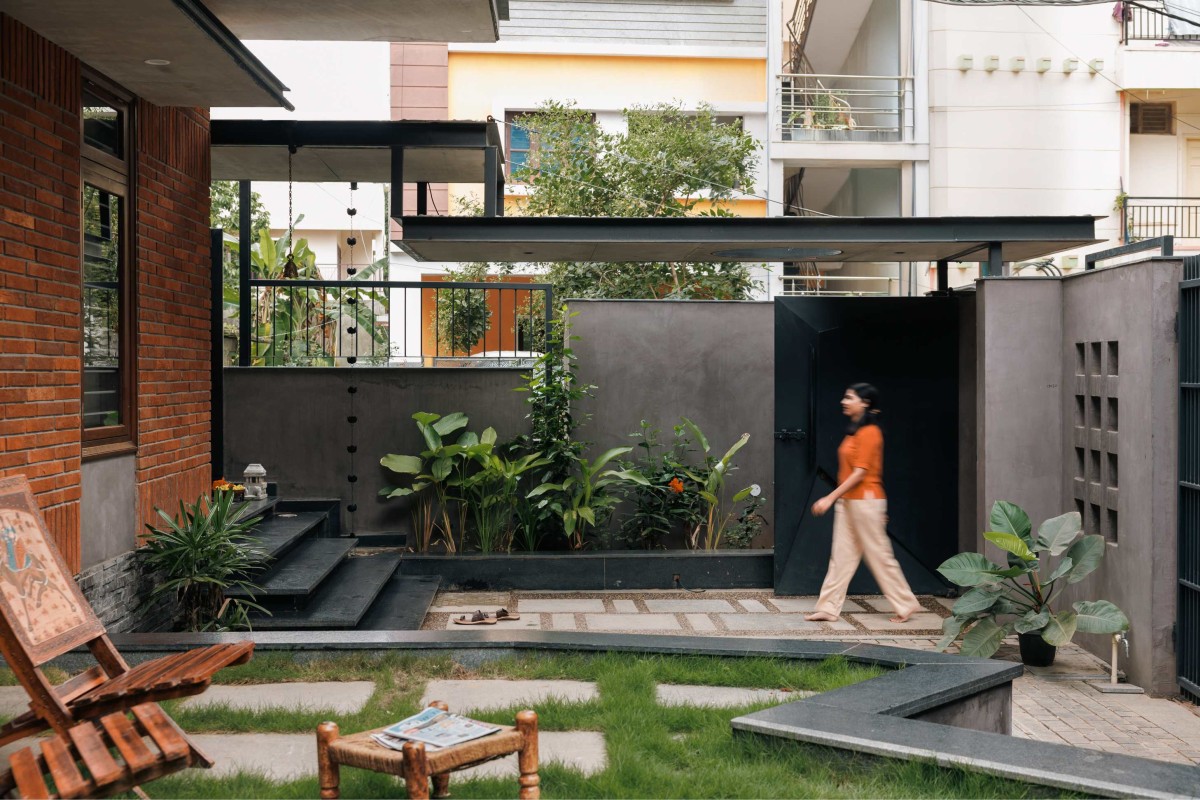 The front of the house is multifunctional, thoughtfully designed to balance privacy and openness. While enclosed like a traditional home, it can effortlessly open to welcome neighbors and friends, fostering a warm atmosphere for informal gatherings and evening conversations. A verandah extends toward the street, maintaining a dialogue between the house and its surroundings, with the Pink Trumpet Tree anchoring the front yard and acting as a defining feature of the entryway.