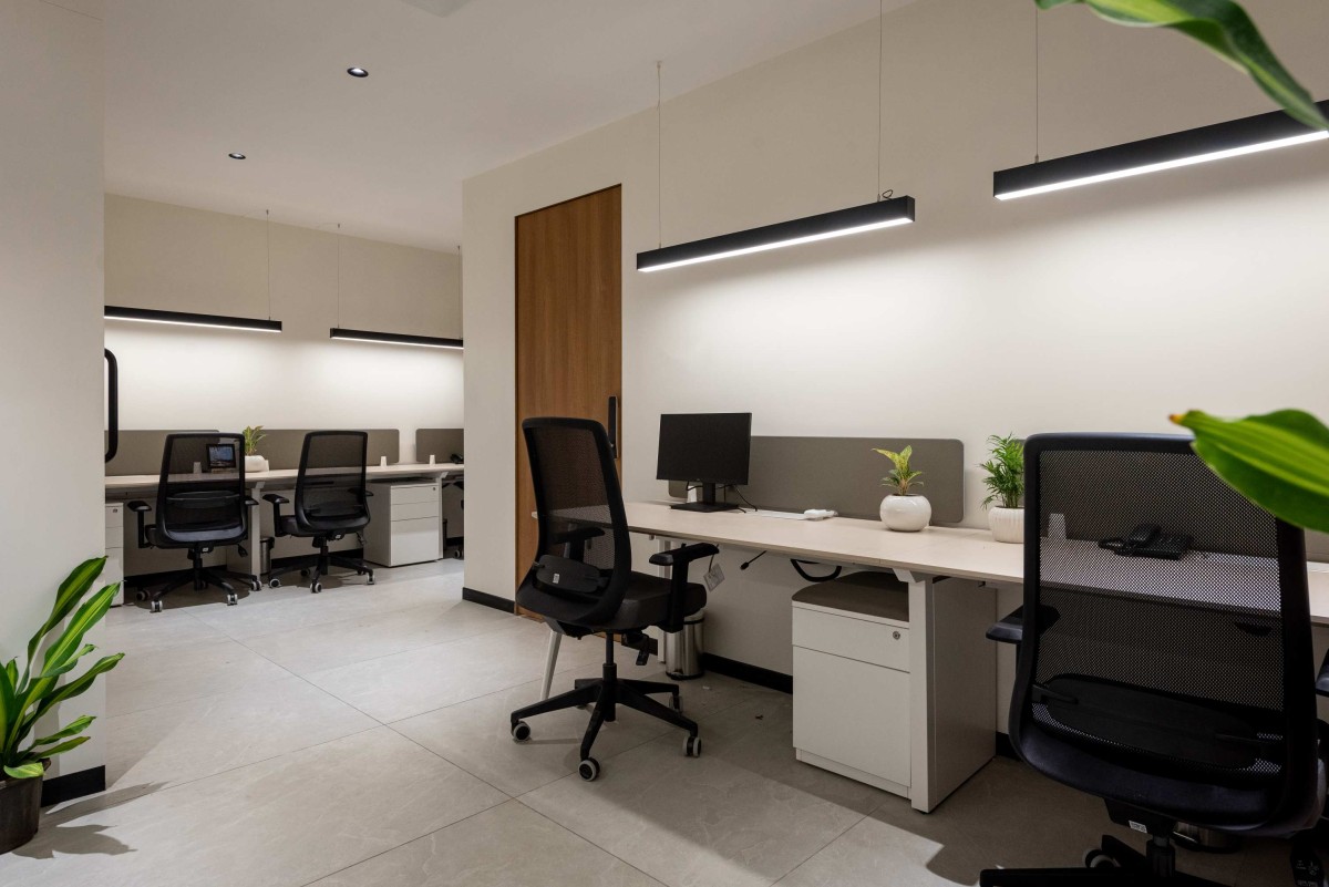 Workstations are thoughtfully planned with ergonomically designed desks, optimized storage solutions, and well-balanced lighting that ensures both comfort and productivity. Complementing these formal zones, the breakout spaces provide informal seating arrangements that encourage brainstorming, collaboration, and moments of relaxation. The material palette emphasizes sustainability, featuring textured finishes and biophilic elements such as indoor plants that bring warmth and vitality to the interiors. Lighting plays a pivotal role throughout, combining natural daylight with efficient LED fixtures and focused task lighting to enhance well-being and minimize eye strain.