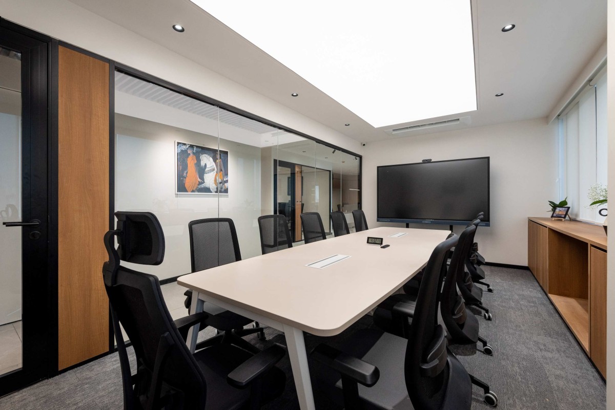 Meeting rooms are equipped with advanced AV systems and acoustic panels, enabling seamless communication in a distraction-free environment.