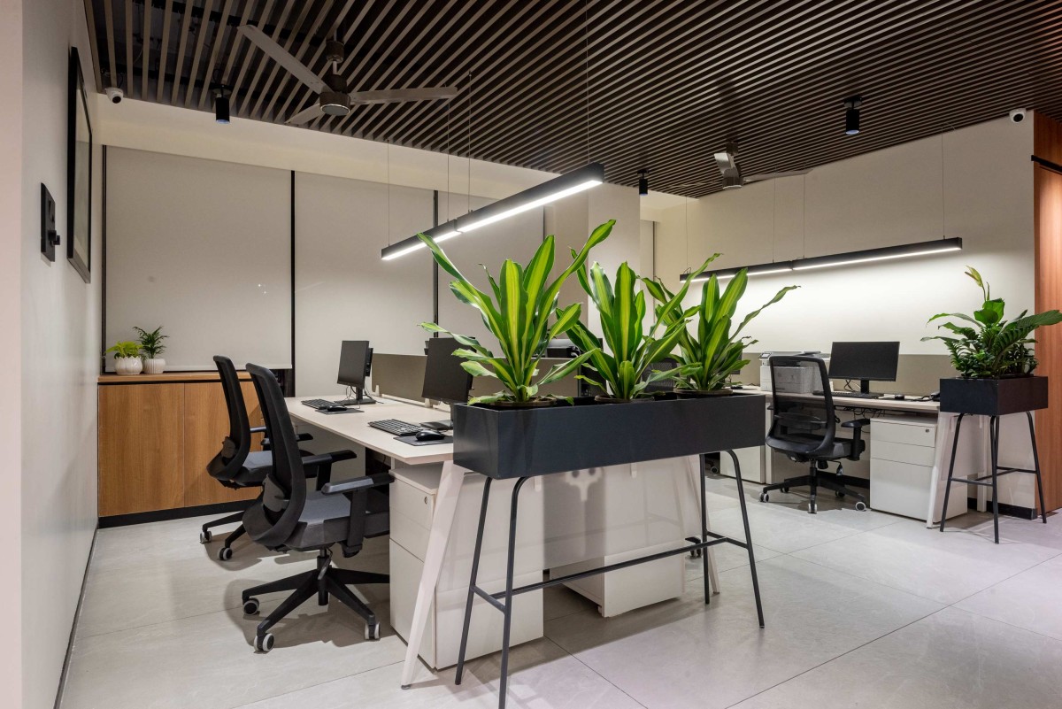 Sustainability and well-being guided material selection and spatial design. Eco-friendly finishes, energy-efficient lighting, and abundant indoor greenery not only reduce environmental impact but also bring a sense of calm to the workspace. The result is an office that reflects the client’s forward-thinking ethos, inspires its people, and makes a lasting impression on every visitor.