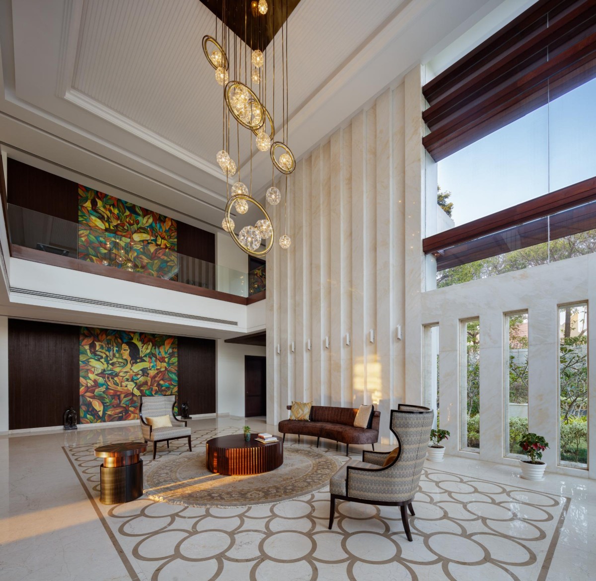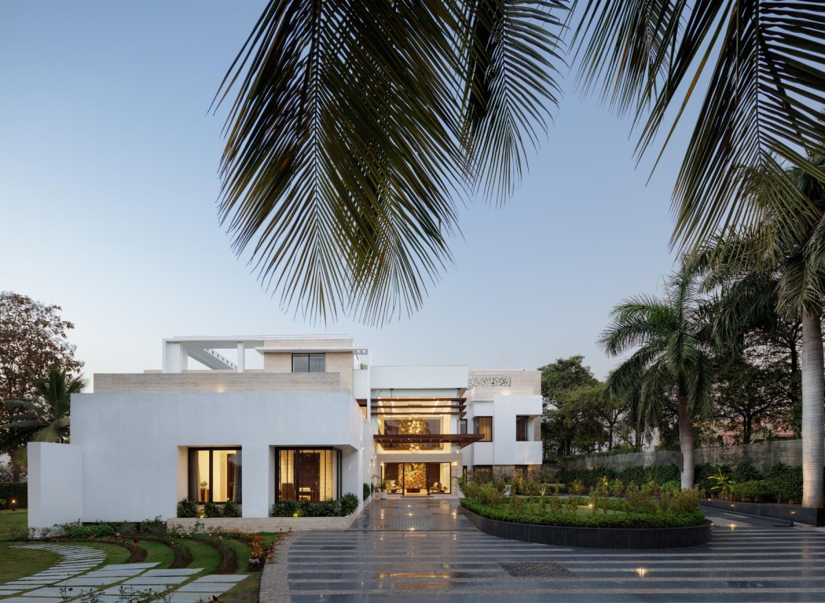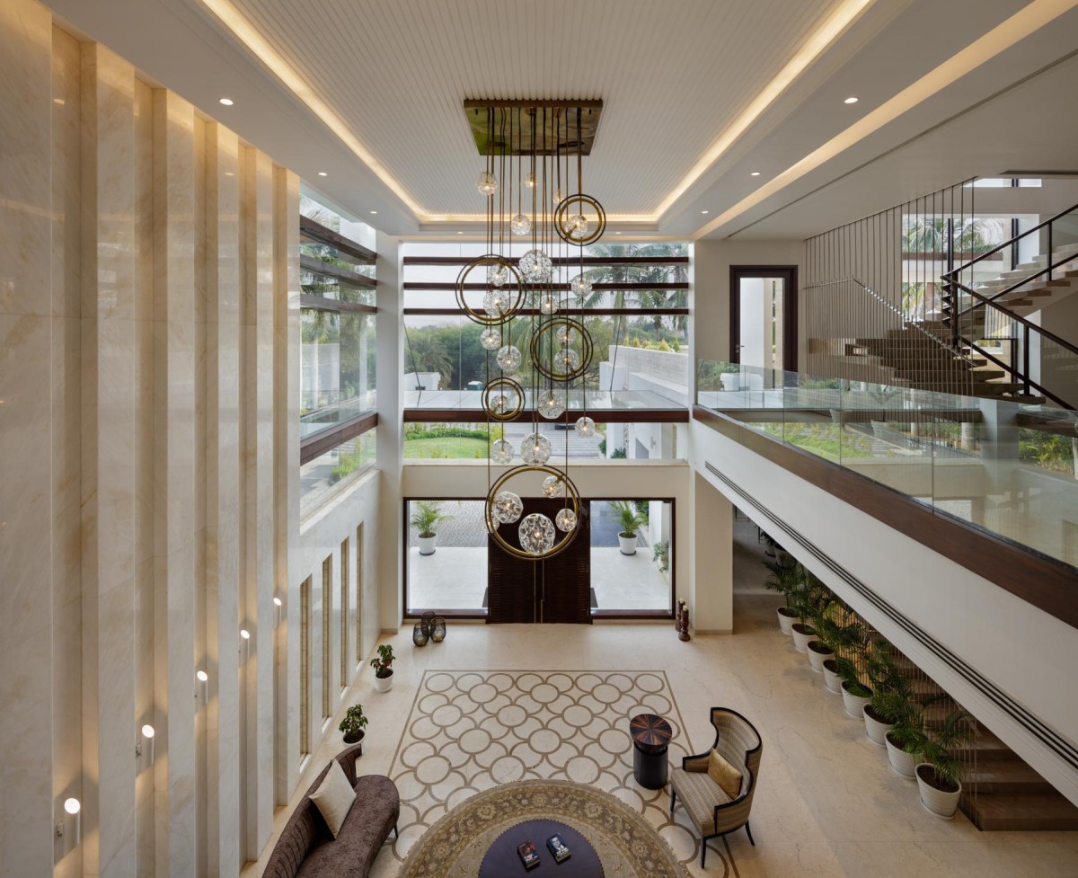 The structure stands above a basement that houses the lounge area. Abundant sunlight is ensured into the basement through a sunken court in the surrounding landscape. The ground floor consists of a bedroom, drawing room, study, dining area, kitchen, and worship room, which surround a double-height living area connected to the guest block through an alleyway. The guest wing serves two bedrooms and office space, and the first floor is occupied by bedrooms for the family. Additionally, the collapsible, dry partition walls offer a high degree of flexibility, creating increased spatial capacity when required. The resultant multi-purpose spaces can be easily converted into a make-shift office or a gym.