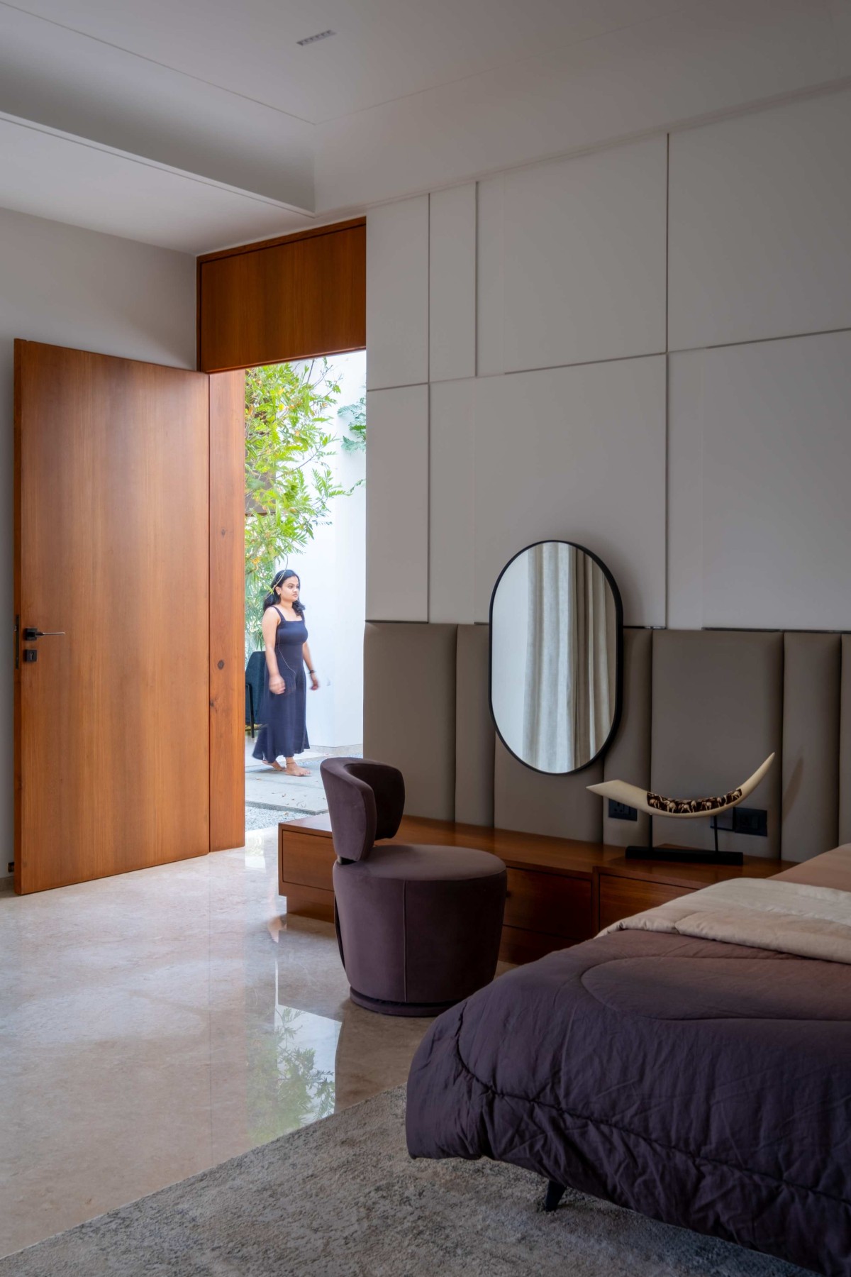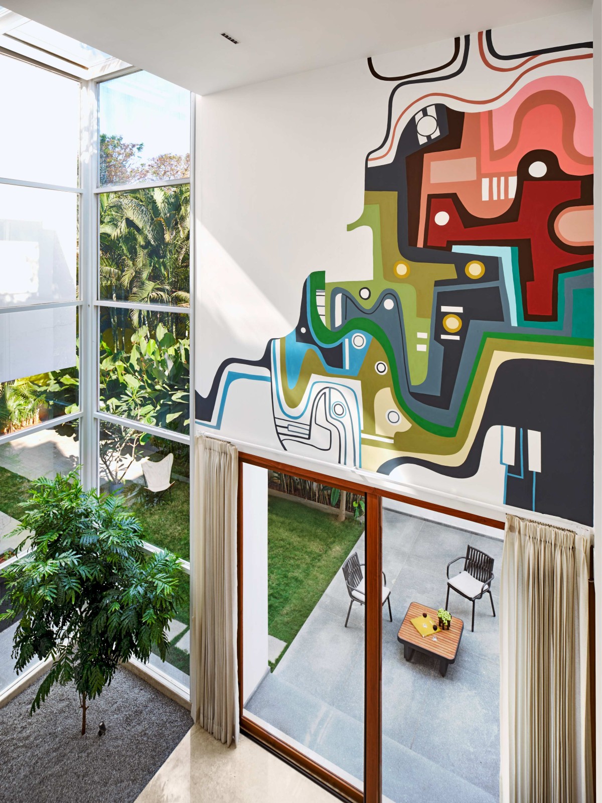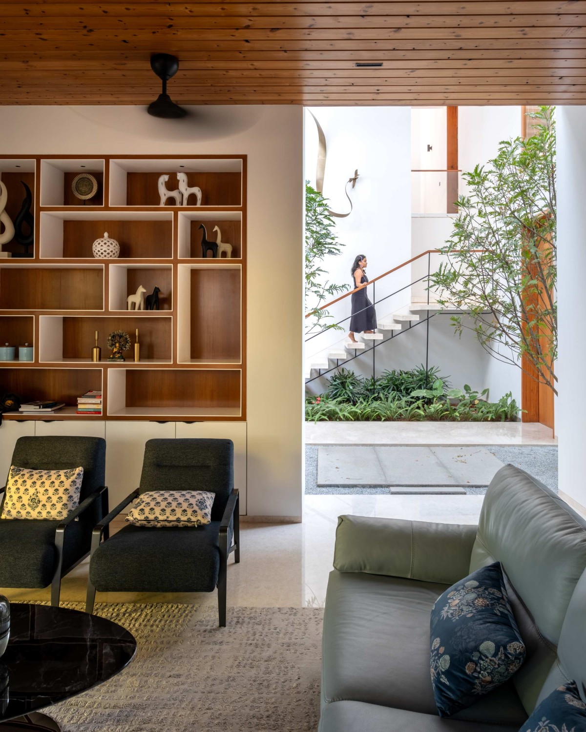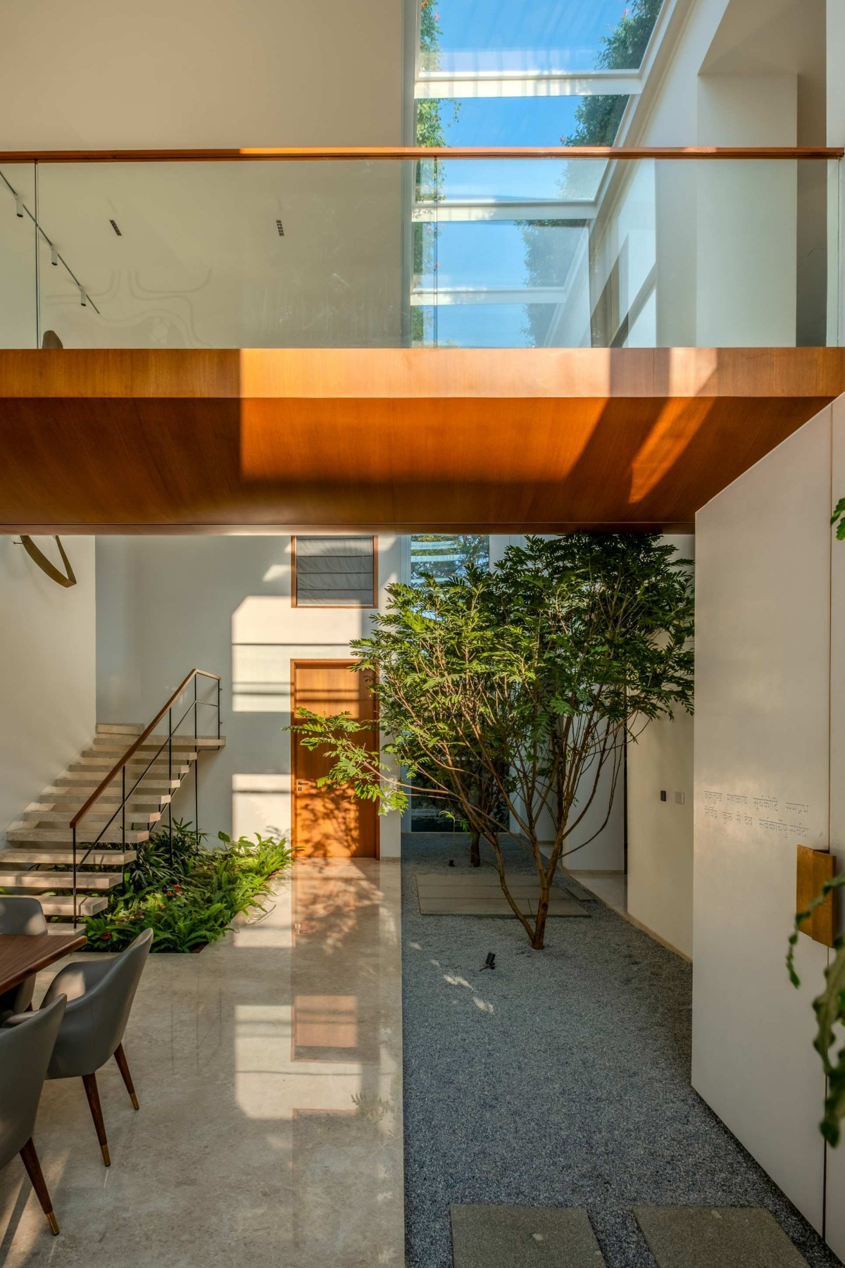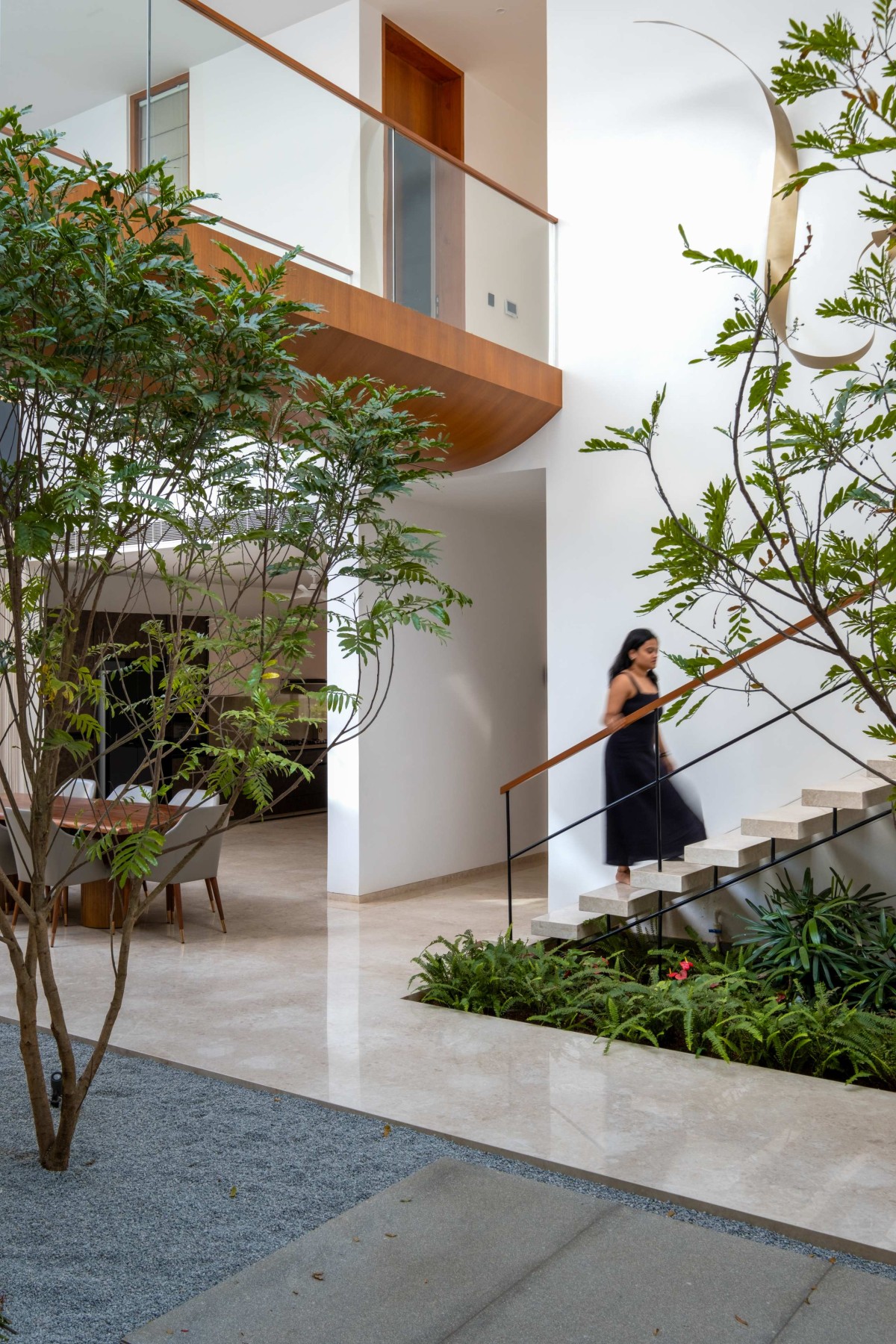 Three slender trees grow from the gravel bed, integrating nature into the home’s core. Beyond them, a white puja room stands out, calm and prominent in the space.
