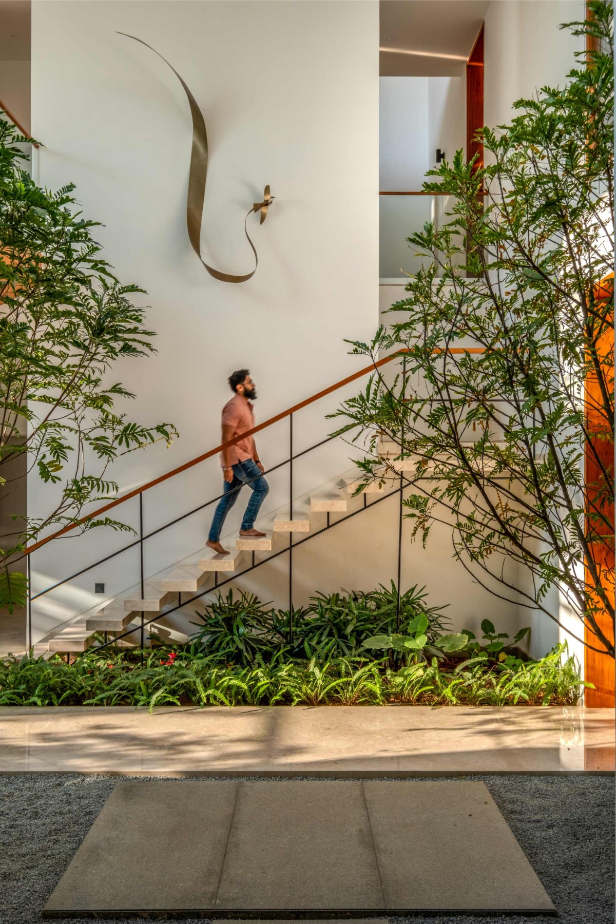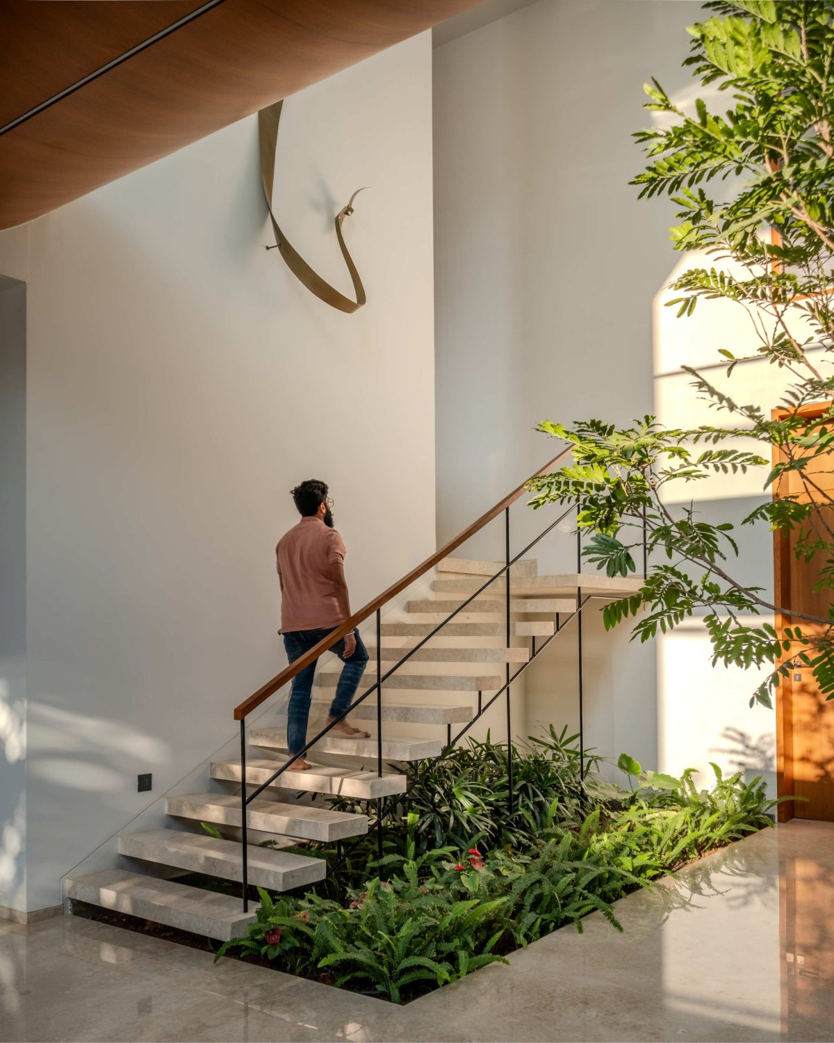 The staircase is a sculptural centerpiece, with concrete treads cantilevered from the wall and supported by a slender metal rod. A teak handrail adds warmth and refinement. Its lightweight design creates an open, airy feel as it curves around the sculpture wall, leading to the second level with elegance and stability.