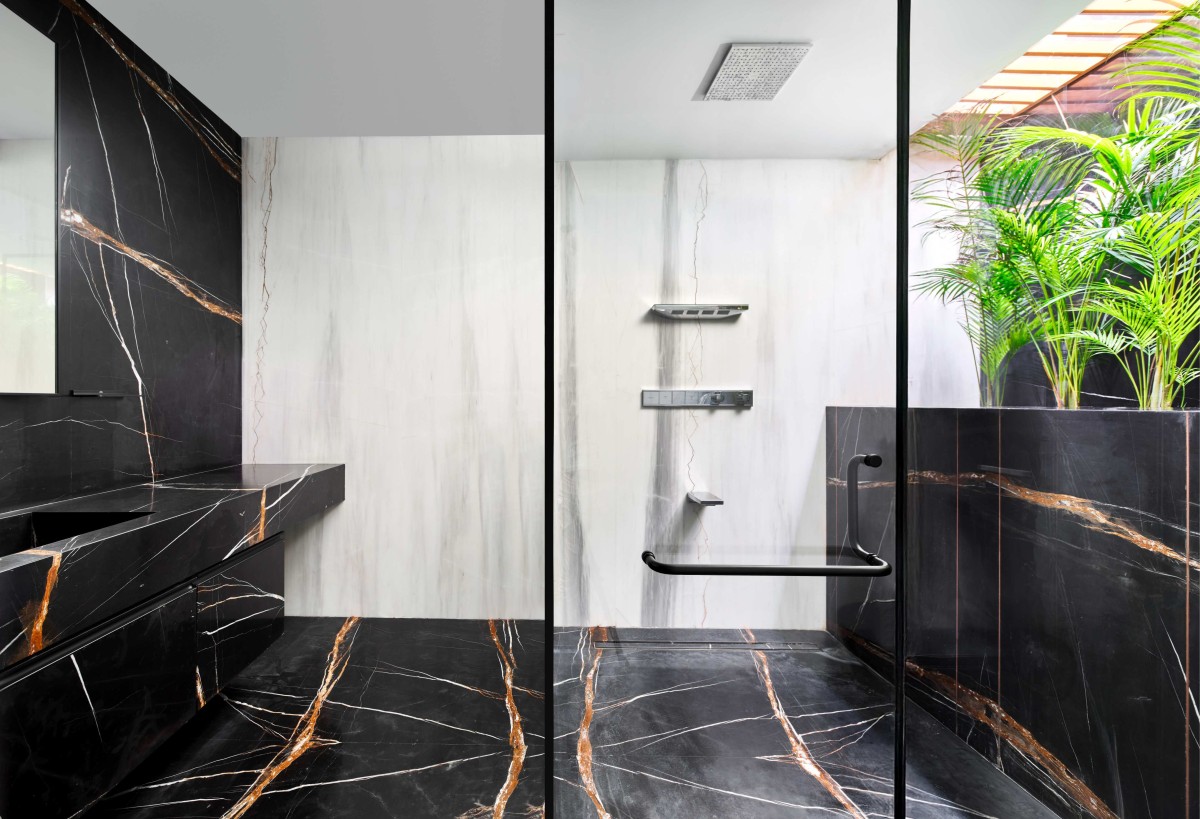 The functionality of the house is as considered as its form. A lift connects all levels right up to the terrace, ensuring ease of access. Practical needs, like a powder room beside the lift, are discreetly yet thoughtfully addressed.