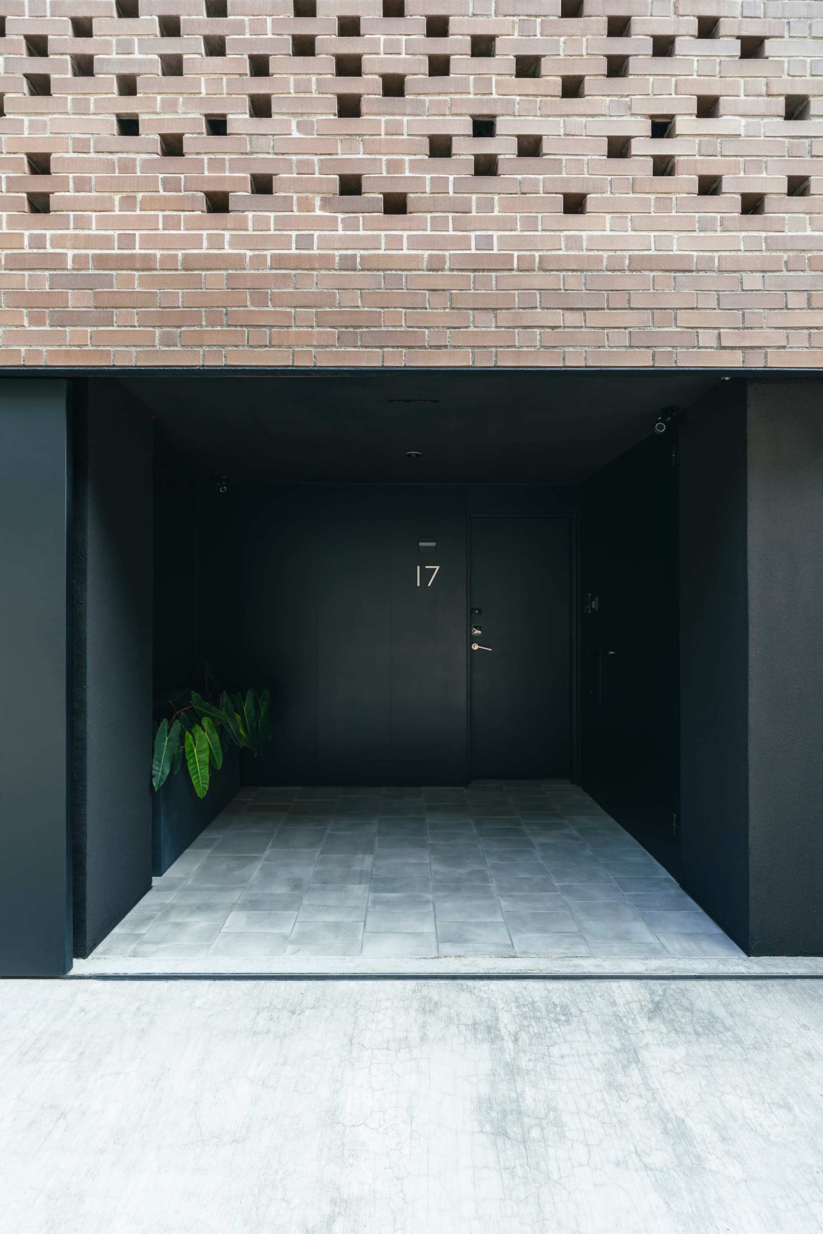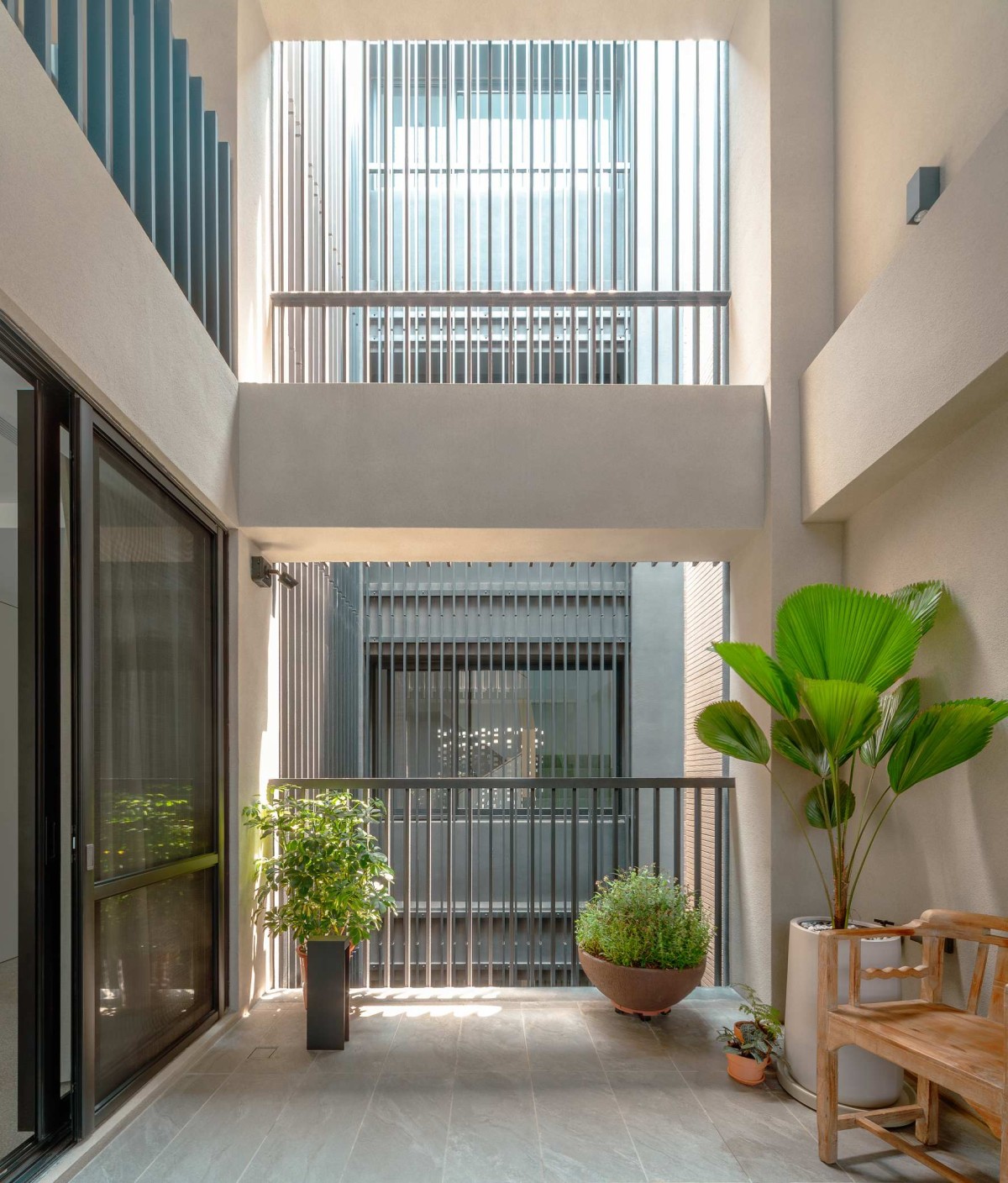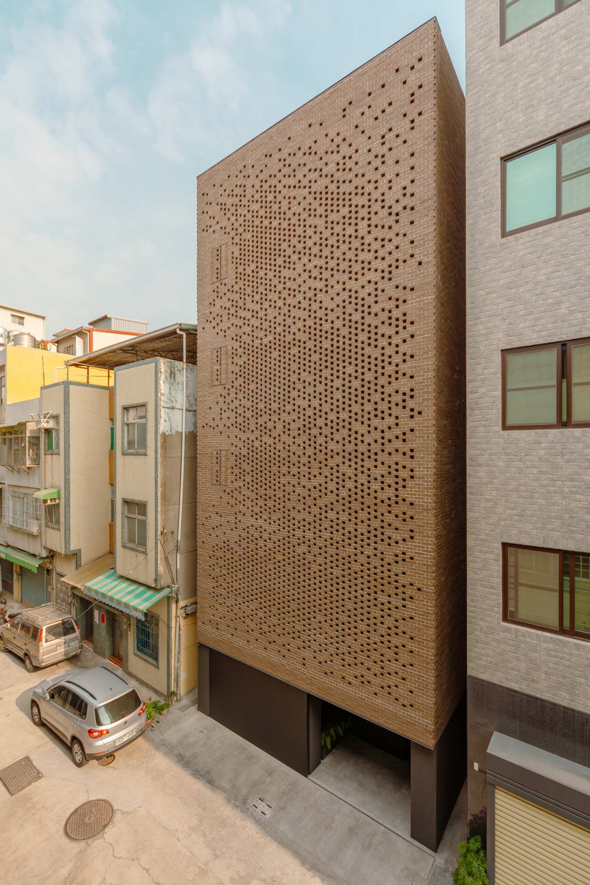 The entry, through an interior garden, helps quiet the transition from the bustling city streets and provides a deep threshold into the heart of the home, thus acting as a type of perforation. The residents circle around an open atrium clad with 2 by 6 vertical aluminum louvers, to enter the main living area on the second floor. This materiality pays homage to another Taiwanese vernacular of protected fenestrations while enhancing the verticality of the home. Programmatically, this atrium is the engine of the house: it is an urban garden on the ground floor; on the bedroom’s balconies it is a light-well introducing natural illuminance into the rooms; it is an airshaft for cross-ventilation with the brick veil at the front facade; and it is a connector that ties circulation and program together across multiple floors.