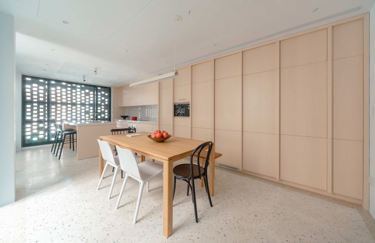 Throughout the home’s interior, custom-designed terrazzo flooring defines spaces within the largely, open-plan living floors, while full-length, custom white-oak millwork conceals not only the kitchen but the entertainment and storage spaces as well. The reductive use of materials enhances the focus on the brick veil and the respite gained in the quiet, minimal interior. The desire to build a cozy, airy lifestyle behind an urban façade that successfully withdraws from the frenetic street life is the defining characteristic of the Veil House.