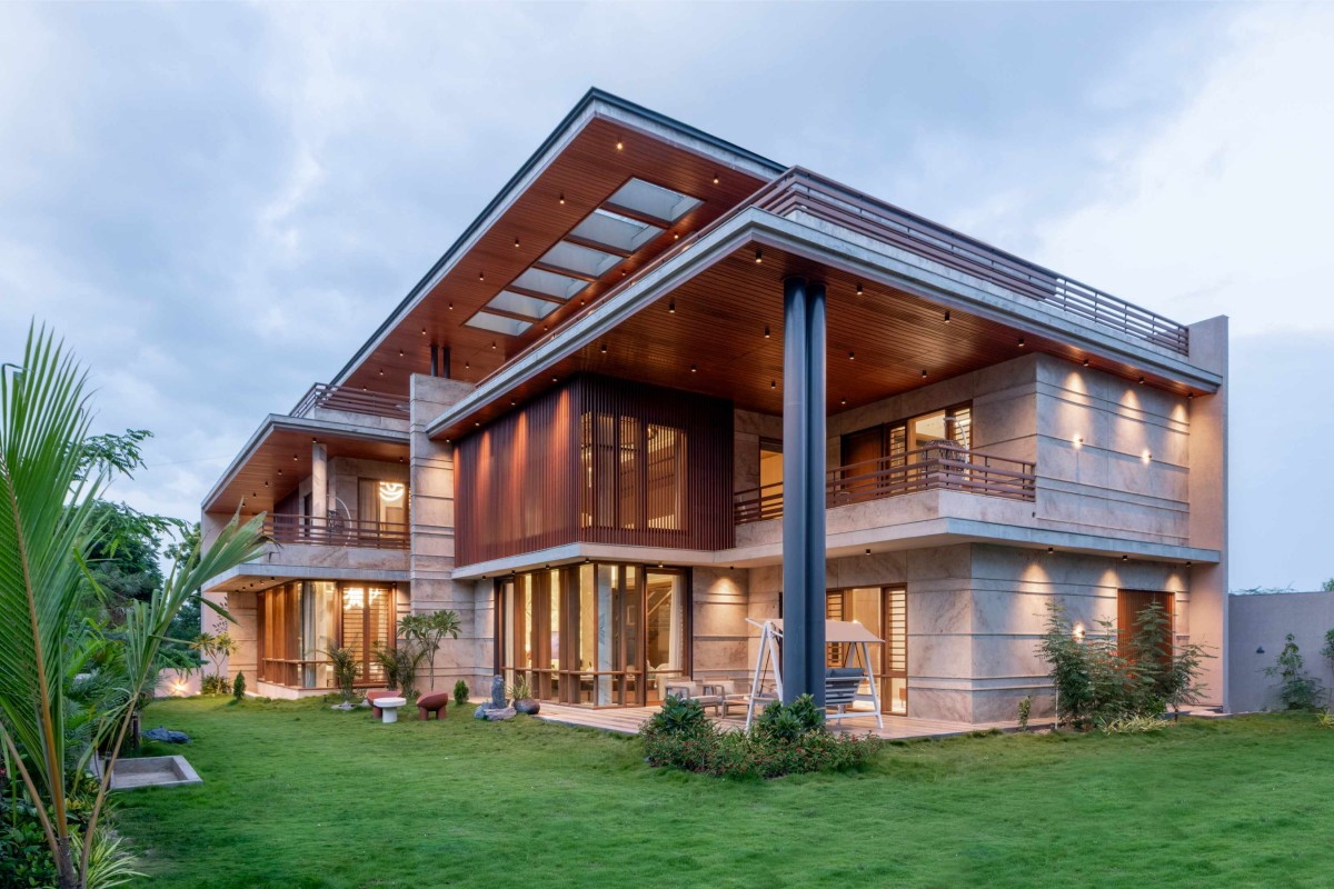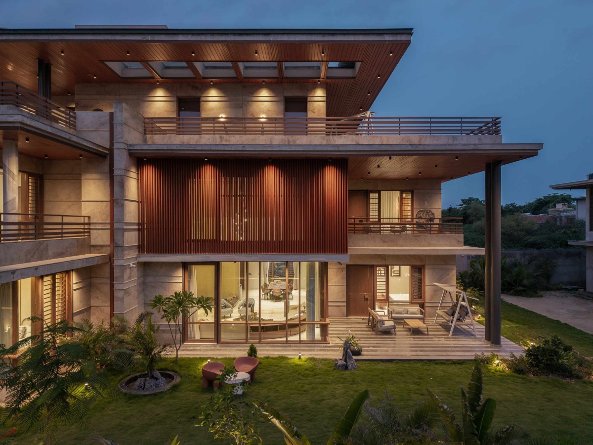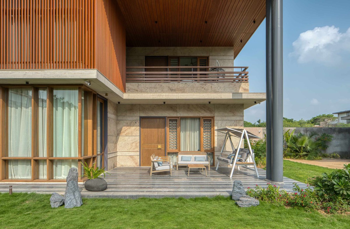 Rooted in the philosophy of seamless indoor-outdoor living, the design ideology is to gracefully open the residence itself to nature, blurring boundaries through expansive openings that invite lush greenery into everyday life. A deep connection to the garden defines the spatial experience, where light, air, and landscape flow uninterrupted. Double-height volumes elevate the sense of openness, while intricate detailing throughout reflects timeless luxury crafting a home where elegance and nature exist in perfect, harmonious dialogue. The overall material palette is kept subtle with natural granite cladding having patterned horizontal strips, wooden doors, large glass windows and exposed R.C.C.