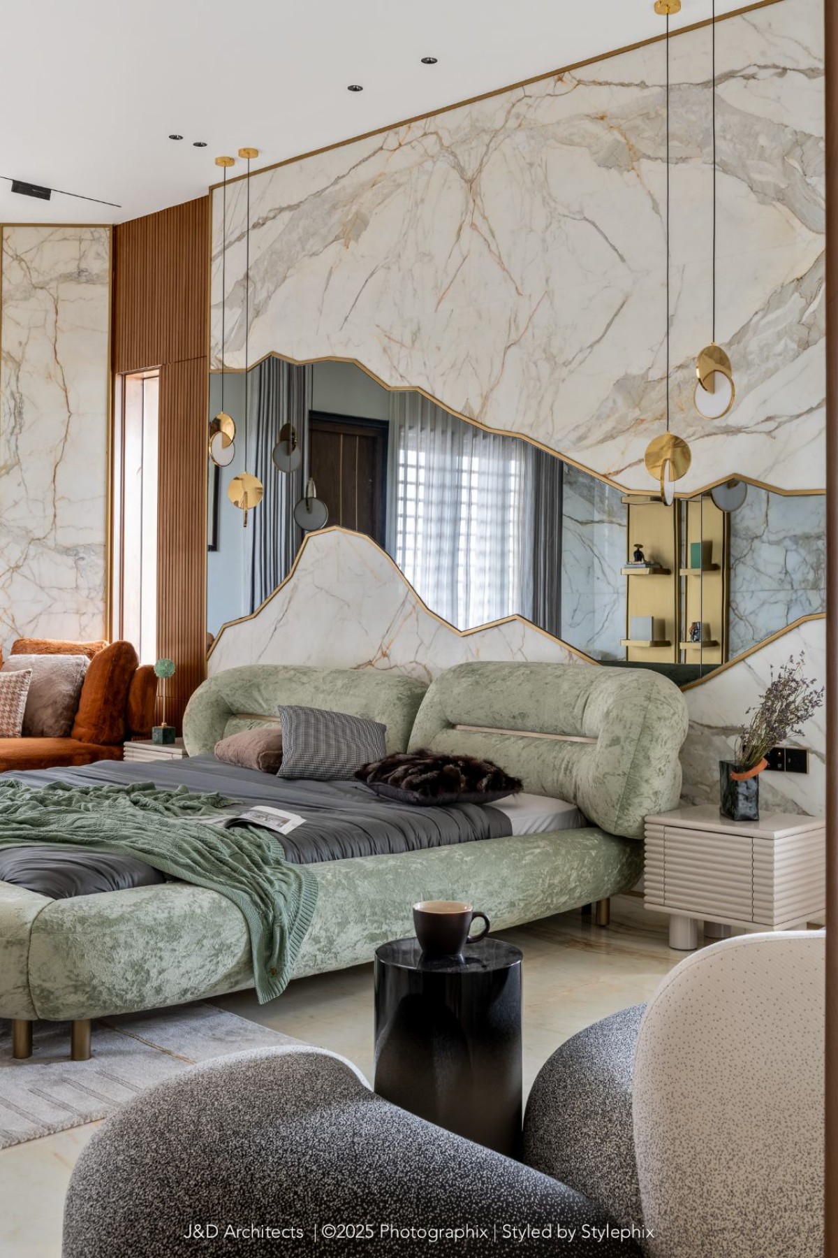 A staircase gently climbs from ground to first, leading to the master’s sanctuary adorned with green onyx framing restful dreams, luxurious closets and baths beside. A terrace opens to endless green vistas. Beyond comes the Vijaybhai’s room that breathes quiet grandeur minimalist yet grand and elevating it with a beautiful walk in closet with indoor courtyard that truly feels like green indoors and the balcony views that capture garden’s soul.