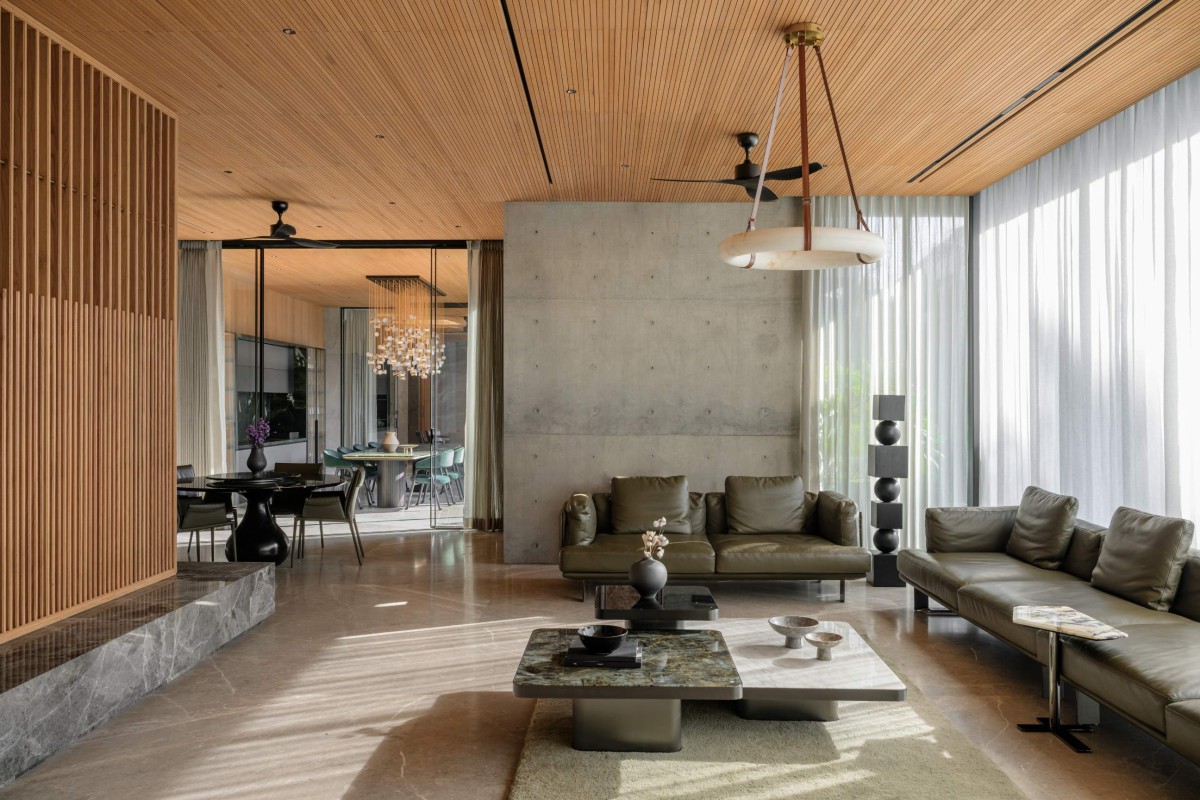 The architecture adheres to a minimalist vocabulary: clean lines, cubic forms, and geometric clarity define the external silhouette. Internally, the spaces unfold with seamless spatial transitions. The design resists excess and ornamentation, relying instead on proportion, light, and materials to evoke character. Contrasting textures—cool concrete, warm timber, and smooth Italian stone—shape a spatial balance that is at once refined and elemental, forming the essence of Twin House’s identity.