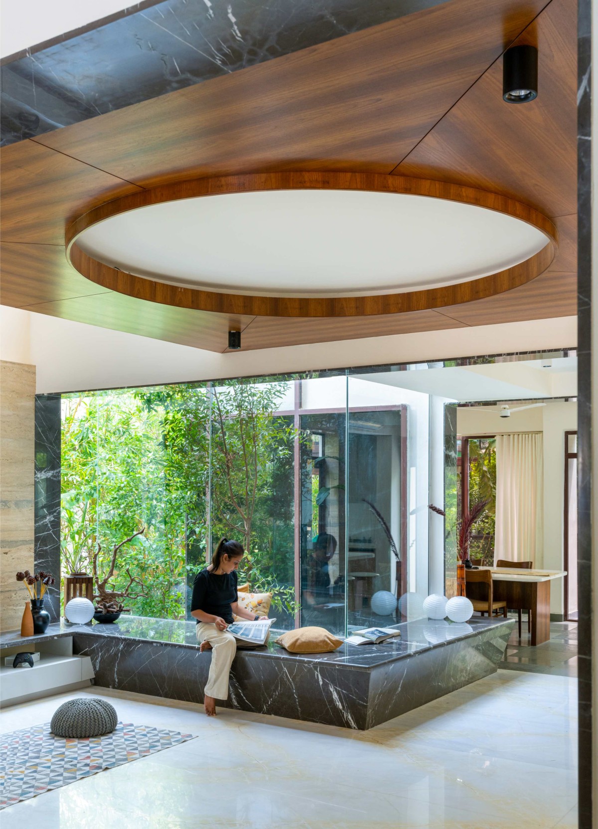 Window Nooks (The Alcove) - At the heart of the house, a U-shaped projection connects the dining, living, and TV areas. Previously enclosed by frosted windows that lacked any character, this space was transformed by replacing the panes with clear glass, inviting garden views inside. A striking black marble seater and sheet glass pergolas overhead further enhance the sense of openness. This design intervention revitalized the home's core, turning it into a dynamic, mufti-functional space. The same approach extends to the panoramic bedroom windows, where simple veneer benches transform them into cozy nooks—showcasing how static architectural elements can become immersive experiences.