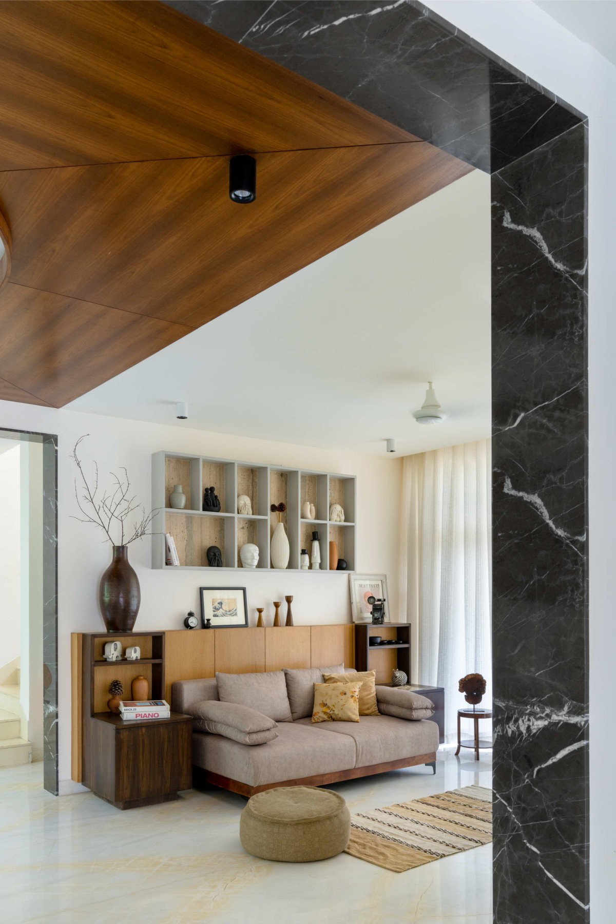 Built-In Furniture - Maximizing space efficiency, built-in furniture is prioritized wherever possible. The cabinetry and furnishings, though minimal, exude casual elegance—like a carefully placed boulder in a Zen Garden. Thoughtful designs, such as wrap-around cabinetry in the living room, pigeonhole shelving for curios ensure functionality and aesthetic coherence. The marble seater was designed to have the gravitational presence of a monolith. Other notable elements include a bull-nosed breakfast counter, Japanese-style platform beds with integrated nightstands, and storage-enhanced window nooks—each reflecting meticulous spatial planning.