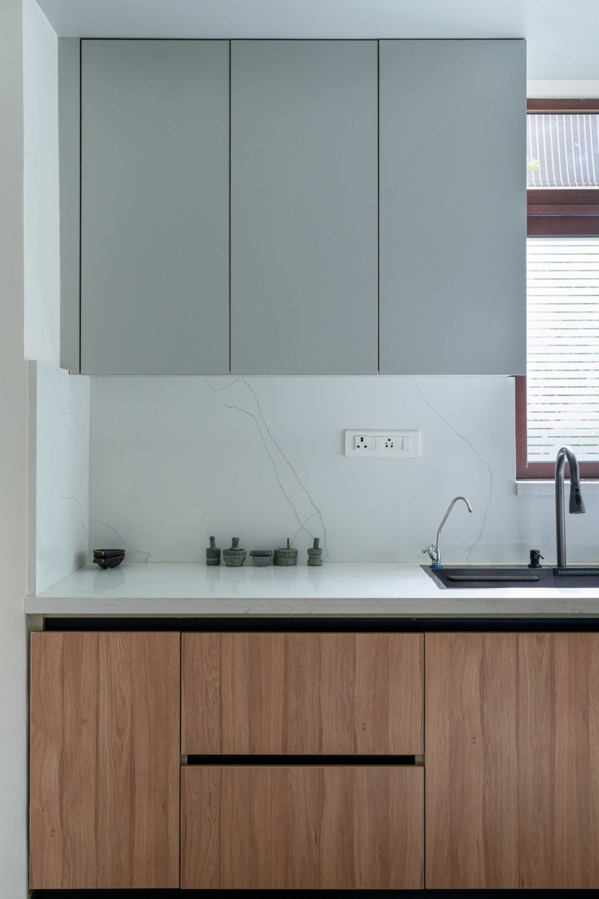 True to Japandi aesthetics, the material and colour palette is natural, rustic, and dignified. The neutral base tones—ranging from alabaster to eggshell—act as a canvas, while three wood shades were chosen to (pine, walnut, and mahogany) add depth. Use of natural materials with all their imperfections gives an unpretentious effect and allows for their appreciation. Natural stone is extensively used, with cream-beige marble flooring in common areas contrasted with black marble-clad door jambs, creating a framing effect at each threshold. This allowed for a pause, to take it slow, to observe and appreciate the space on the other side. The kitchen floor was designed for tactile interest, combining two finishes of slate grey granite. Muted Grey and pine cabinetry keeps the focus on the white quartz counter tops.