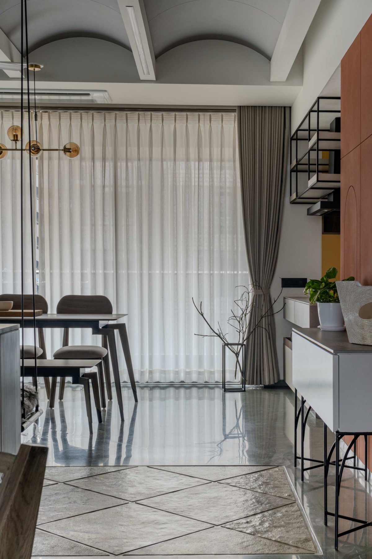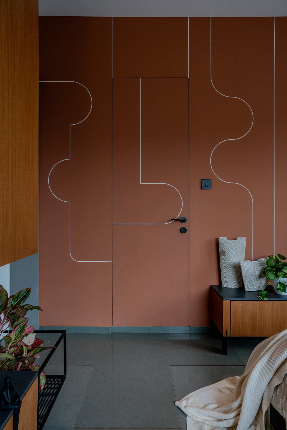 The entrance, a prelude to the journey within, is conceived as an art gallery. The moment the door opens, a red sand dunes texture stretches across the walls, evoking raw, elemental landscapes. This tactile surface wraps around to the kitchen, guiding movement and perspective, drawing one deeper into the core of the home.