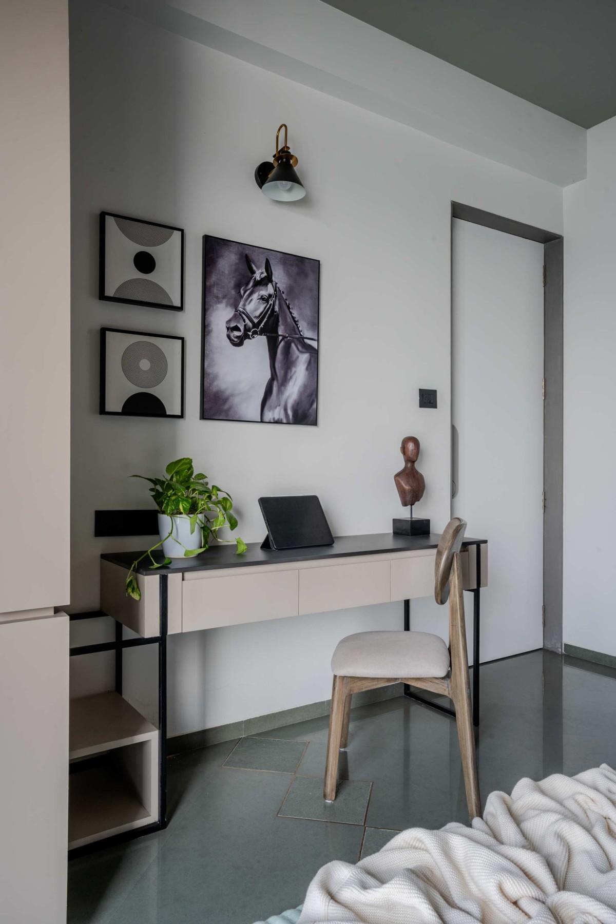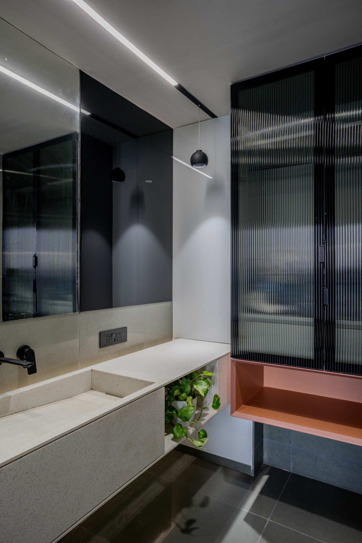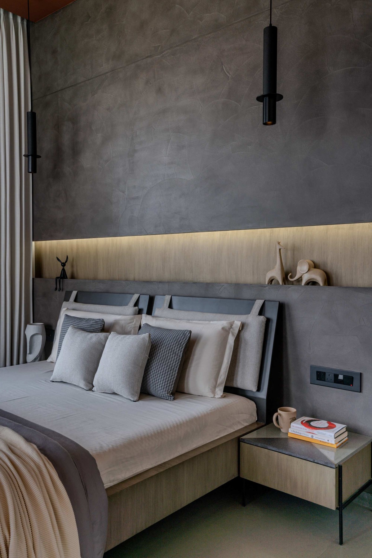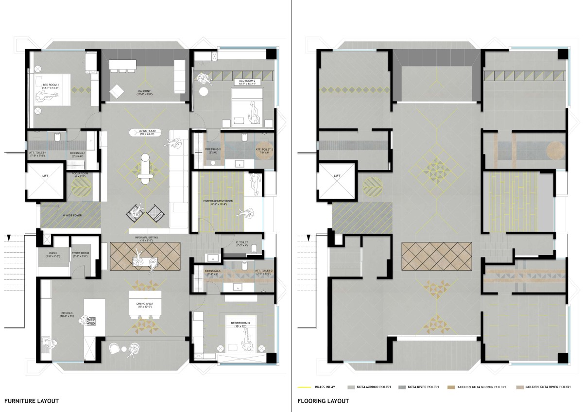 By embracing the riverfront setting, the apartment opens itself to uninterrupted views and natural light, creating a serene and contemplative environment. The use of tactile materials like red sand dunes texture and Natural Kota stone speaks to the clients’ desire for authenticity and connection to the earth. The open layout, fluid transitions, and bespoke detailing reflect their need for both functionality and artistic expression — crafting a home that is deeply personal, immersive, and evocative of its riverside context.