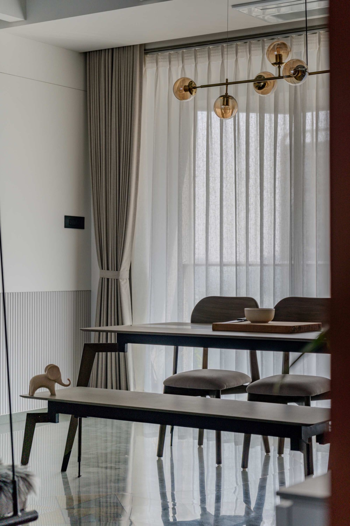 Underfoot, Kota stone, honed to its natural finish, grounds the interior in tactility. Each step connects the resident to the earth, a sensory reminder of the natural world that permeates the design. In the informal area between the living and dining, river-finished golden Kota stone is laid diagonally, framing a swing — an element of playful suspension, movement against the stillness of stone.