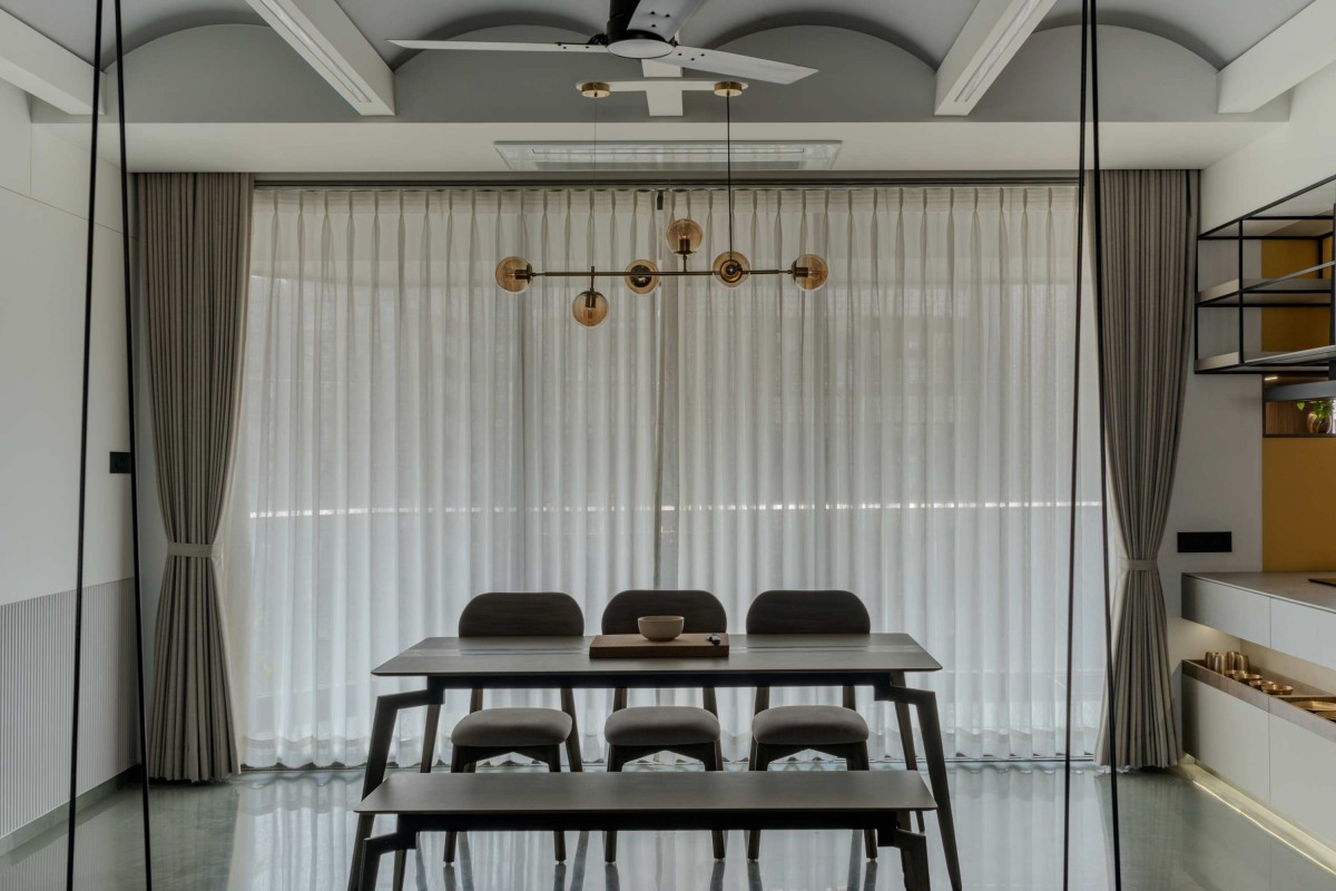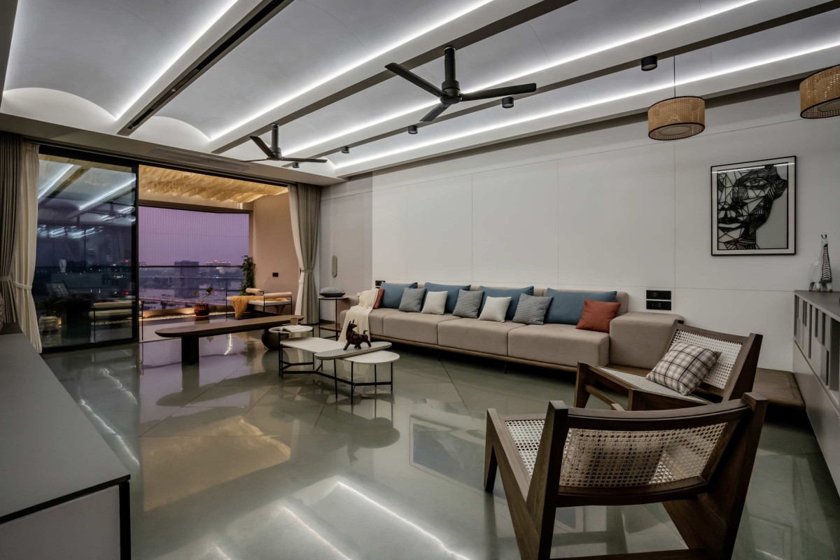 At the heart of the space, an open floor plan allows for the free interplay of light, shadow, and view. The river is always present, unfolding like a living mural through the expanse of glass. The living room, which opens seamlessly onto the deck, becomes an extension of the river itself. The deck’s ceiling, a sculptural fabric installation in a wave pattern, moves with the breeze, animating the space with the fluidity of water, mimicking the gentle flow of the Tapi below.