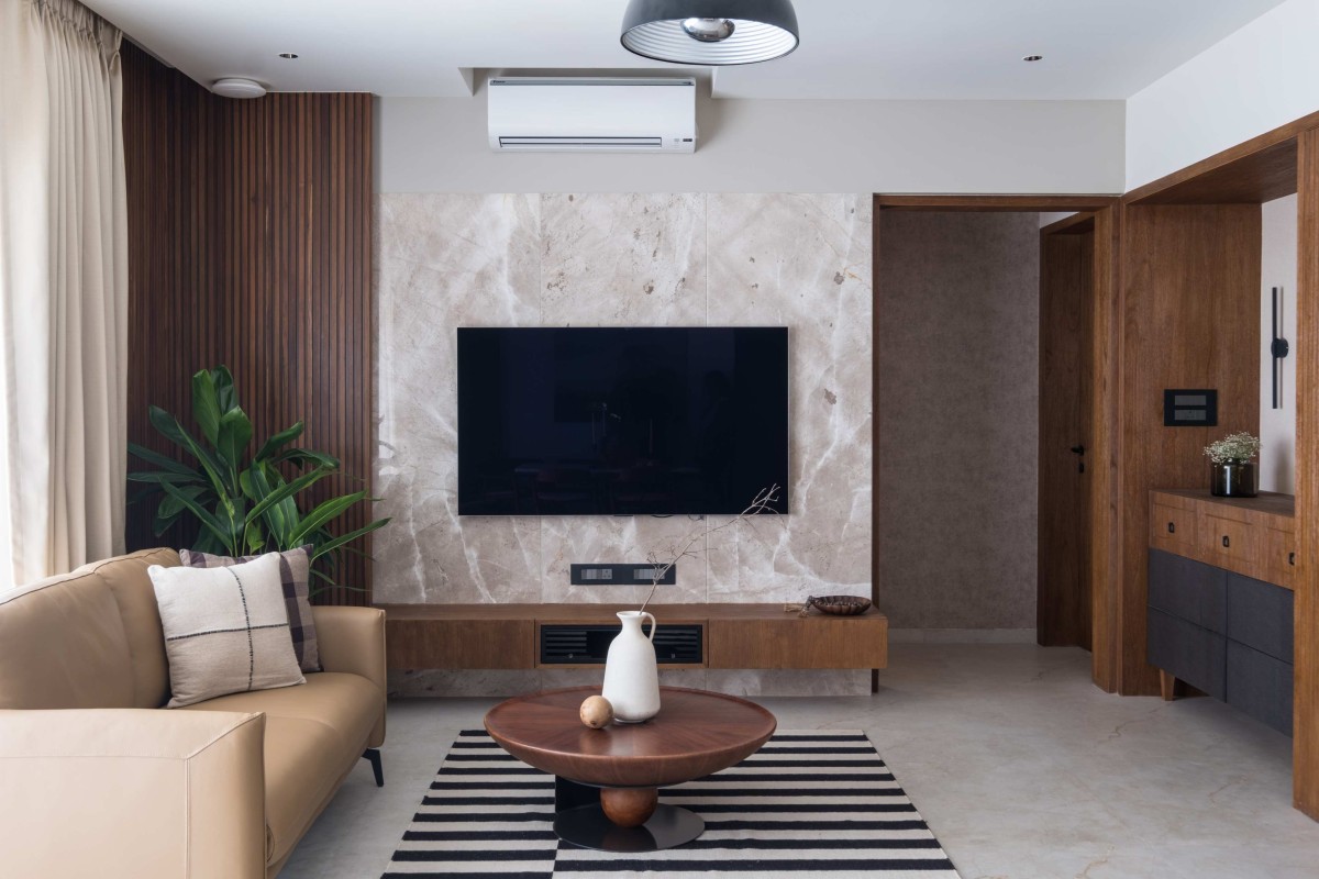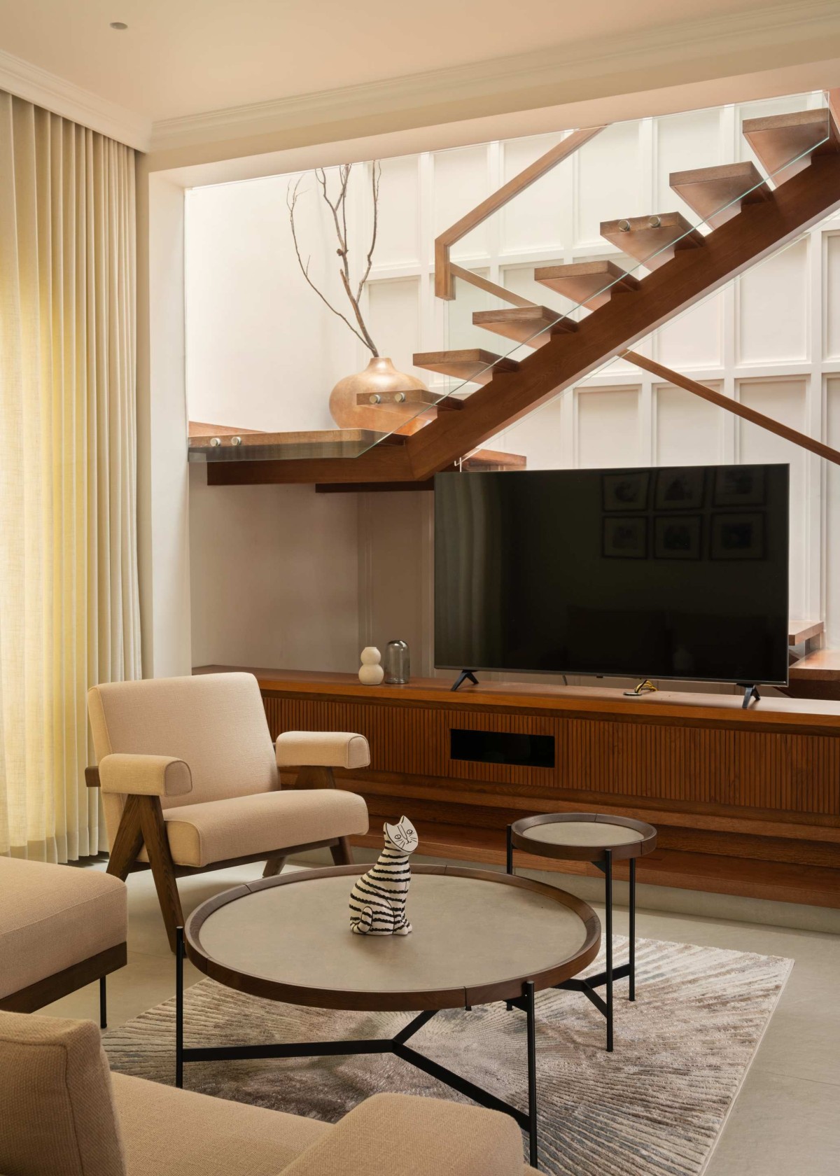 The custom-designed TV unit is seamlessly integrated with the staircase, forming a cohesive architectural composition rather than a standalone element. Positioned against a backdrop of paneled walls, it aligns with the stair geometry, reinforcing visual continuity within the space. A skylight above the stairwell introduces diffused natural light, enhancing the warmth of the wooden surfaces and ensuring the area remains well-lit throughout the day. The inclusion of indoor plants softens the composition, adding a layer of vitality to the otherwise restrained palette.