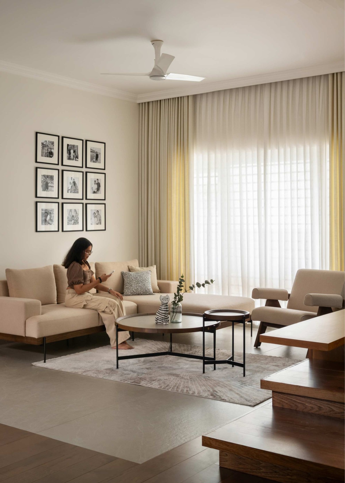 Positioned within a transitional zone of the house, the informal living space acts as a connective hinge between the dining and formal living areas. Defined by its openness and accessibility, it remains visually and spatially integrated while retaining its own functional identity. Expansive windows allow generous daylight to permeate the space, softened by layered drapery to create a calm and inviting atmosphere. A custom-designed TV unit anchors the setting, while a curated wall of family photographs introduces a personal layer, grounding the otherwise minimal composition in lived experience.