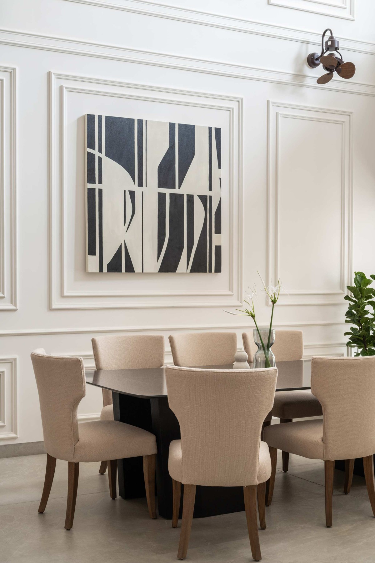 Defined by its verticality, the double-height dining area amplifies the architectural language of the house through an extended wainscoted surface that reinforces rhythm and scale. This classical backdrop is contrasted by a bespoke modern artwork, introducing a layer of abstraction within the ordered framework. The restrained palette and minimal material expression allow light and proportion to dominate, while the console unit subtly grounds the space. The result is a dining environment that balances spatial drama with everyday functionality.