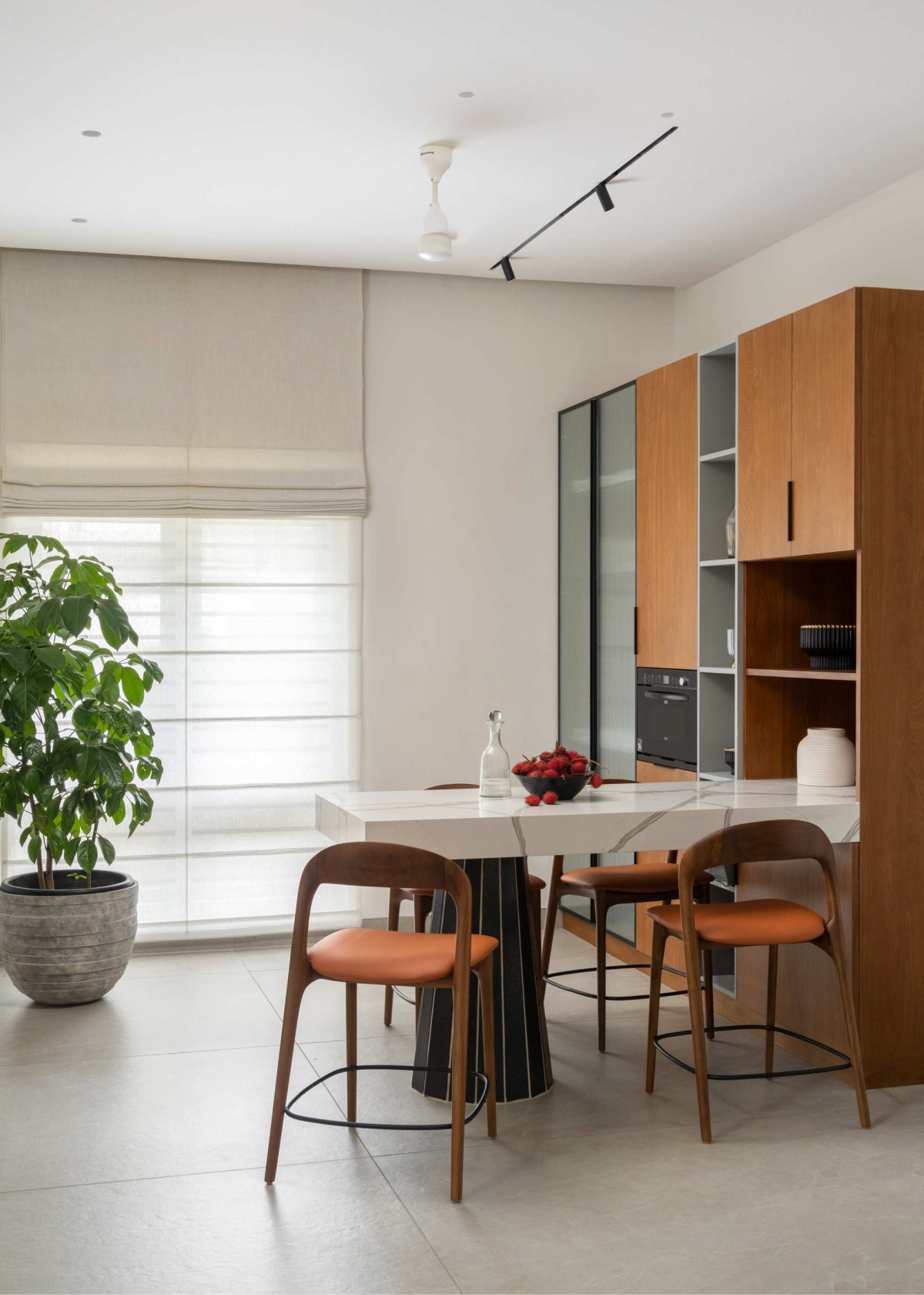 Designed as an intimate pause within the domestic layout, the pantry area integrates functionality with restraint. The bespoke breakfast counter—defined by a monolithic granite leg and a seamless Corian surface—acts as both a working and social interface.A built-in display and storage unit ensures functional efficiency while maintaining a clutter-free environment. Soft daylight filters through the openings, enhancing the neutral palette, while a carefully placed planter introduces a subtle layer of greenery, softening the overall composition.