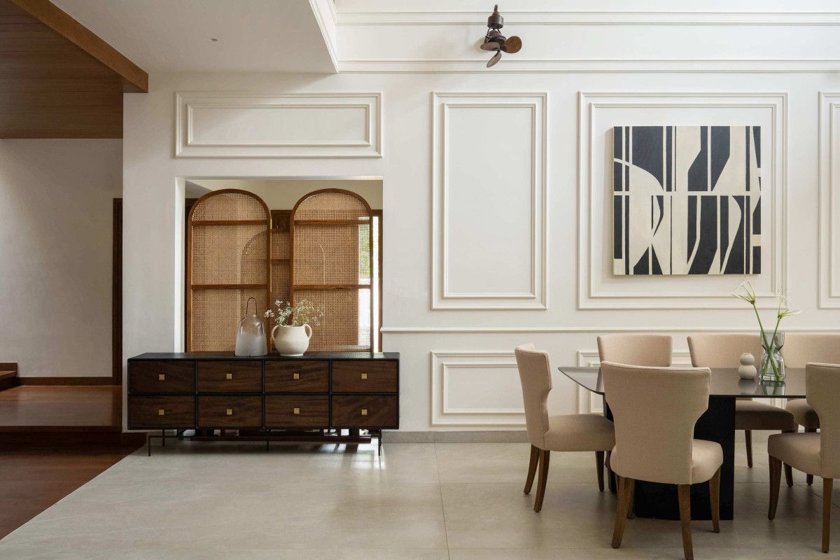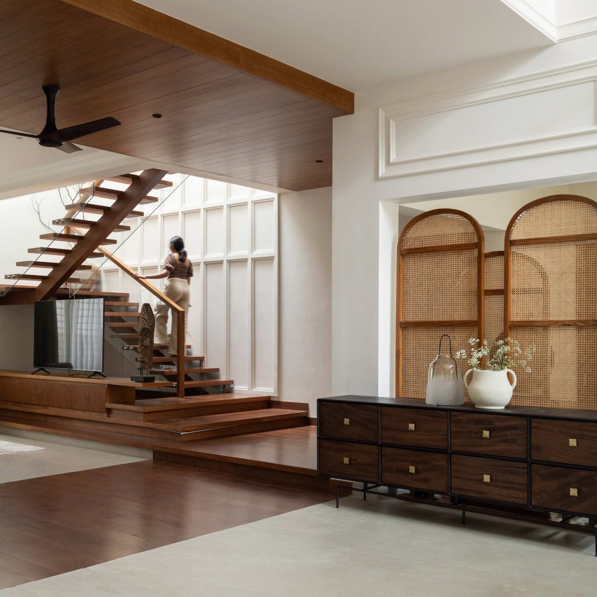 Positioned as a vertical connector, the staircase transcends its functional role to become a spatial experience defined by light and material. The use of teakwood grounds the composition, while glass railings dissolve visual barriers, enhancing continuity. Above, a skylight activates the volume, allowing daylight to cascade along the wainscoted double-height wall. This structured backdrop is punctuated by a striking artwork, creating a moment of pause within movement and reinforcing the staircase as the visual and experiential core of the house.