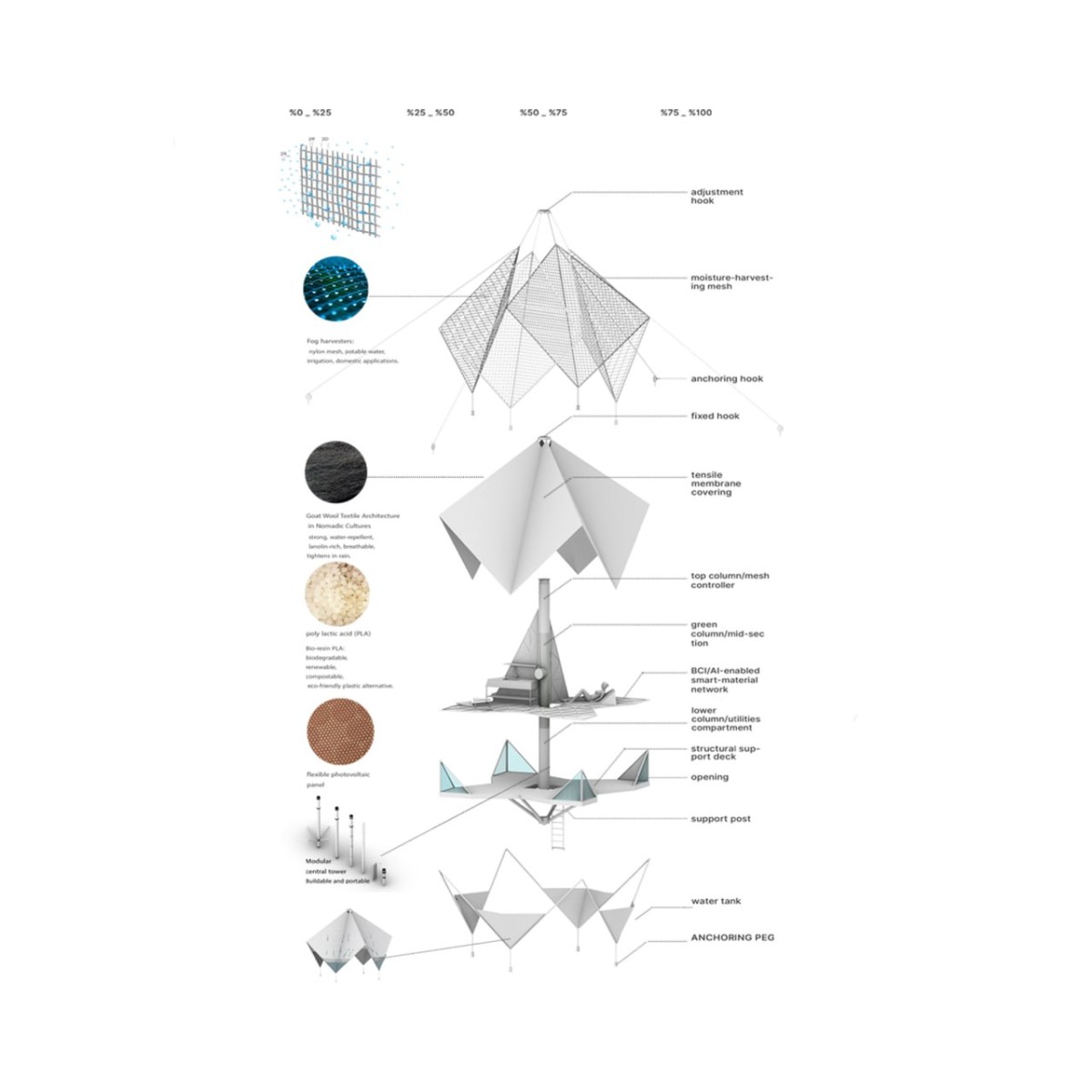 AEF- we have long envisioned a small-scale, mobile house capable of addressing essential human needs—especially access to water—in the face of future climate crises. Inspired by the drying HAMUN Lake and the resilient lifestyle of local nomads, we designed a forward-thinking shelter that harvests atmospheric moisture and transforms it into drinkable water. Beyond meeting vital needs, the project seeks to preserve a disappearing ecological and cultural way of life. By reinterpreting traditional nomadic tents and enhancing their performance, the design offers a sustainable, culturally rooted, and contemporary housing model aligned with the realities of today and the challenges of tomorrow.