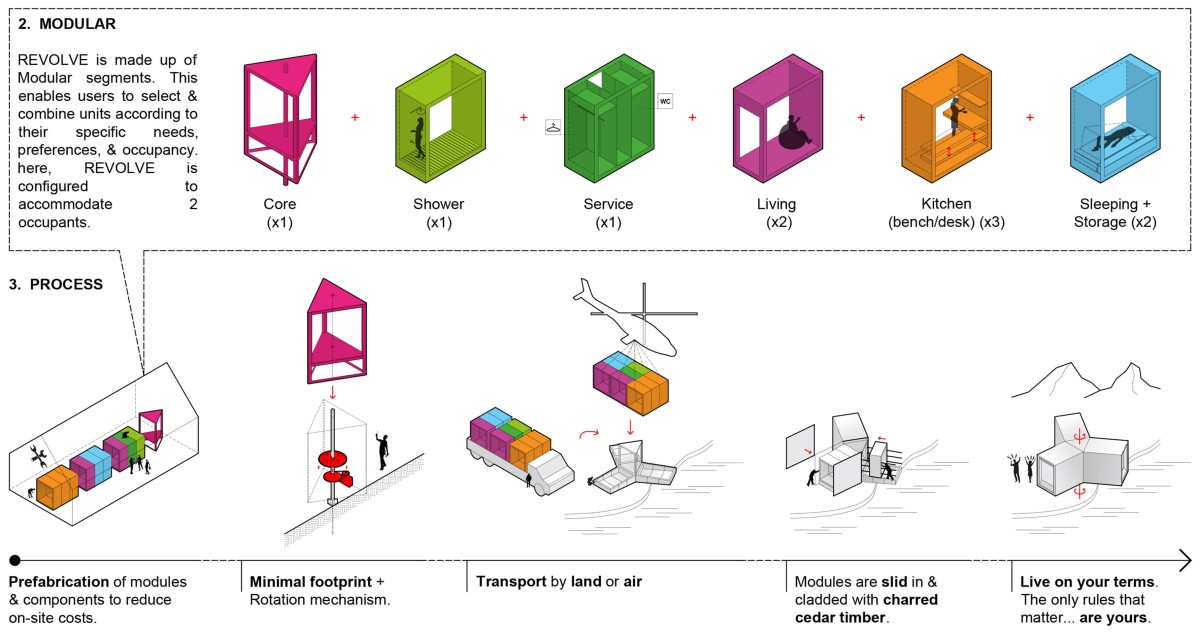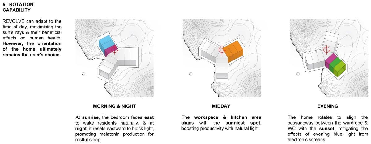 SO- We began by questioning how a tiny house could adapt not just to place, but to time—responding to changing daylight, moods, and rhythms. This led us to explore rotation as a spatial strategy, aligning the home to the sun’s path and the occupant’s circadian cycle. We broke down the programme into modules, each with a distinct function, allowing flexibility in layout and assembly. Instead of focusing on mobility as transport, we treated it as temporal adaptability. Revolve became a home that orients itself to life as it unfolds—quietly dynamic, compact, and in constant dialogue with light and landscape.
