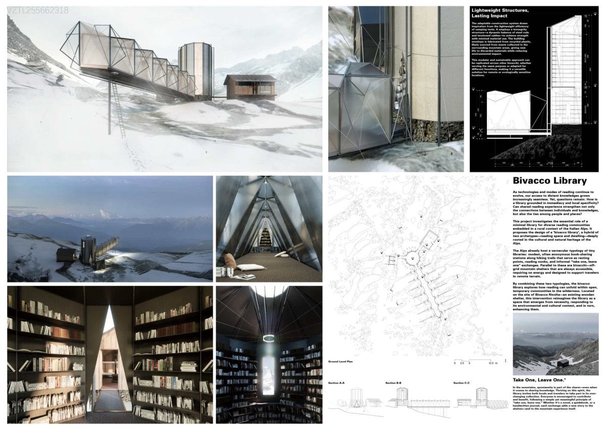 This project investigates the essential role of a minimal library for diverse reading communities embedded in a rural context of the Italian Alps. It proposes the design of a “bivacco library”, a hybrid of two archetypes-reading space and dwelling-deeply rooted in the cultural and natural heritage of the Alps.