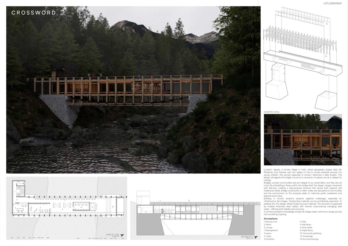 Agoda, a remote village in India, where geography shapes daily life. Residents must traverse vast river valleys on foot to access essential services. For young children, this journey especially to school - becomes a daily burden. This design reimagines the bridge not just as a connector of places, but as a catalyst for change.